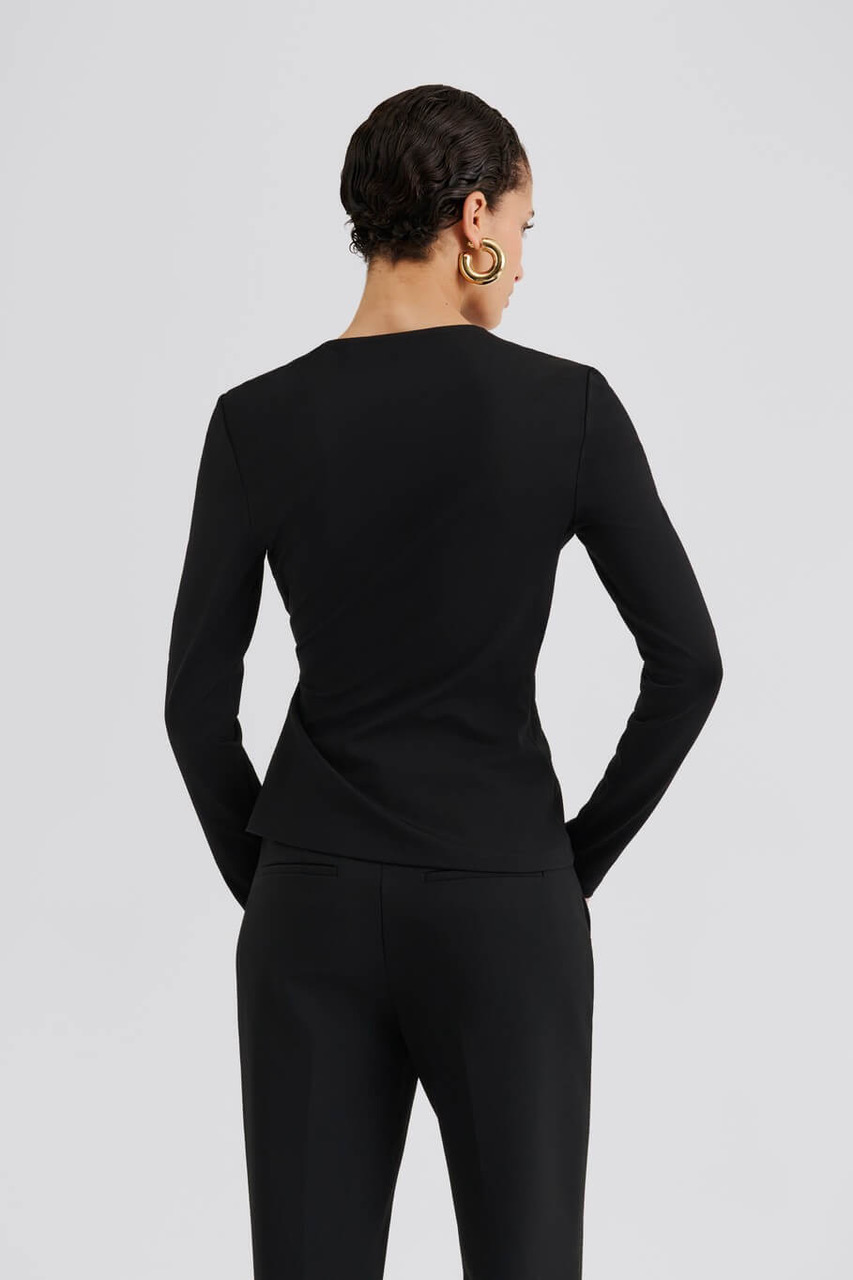 An elegant jersey top with a draped waist and subtle sheen. The Mailey top combines a fitted silhouette with a soft structure that flatters the body, while the gold-toned detail adds a touch of luxury. Perfect to pair with tailored trousers or a skirt for a sophisticated, evening-ready look.