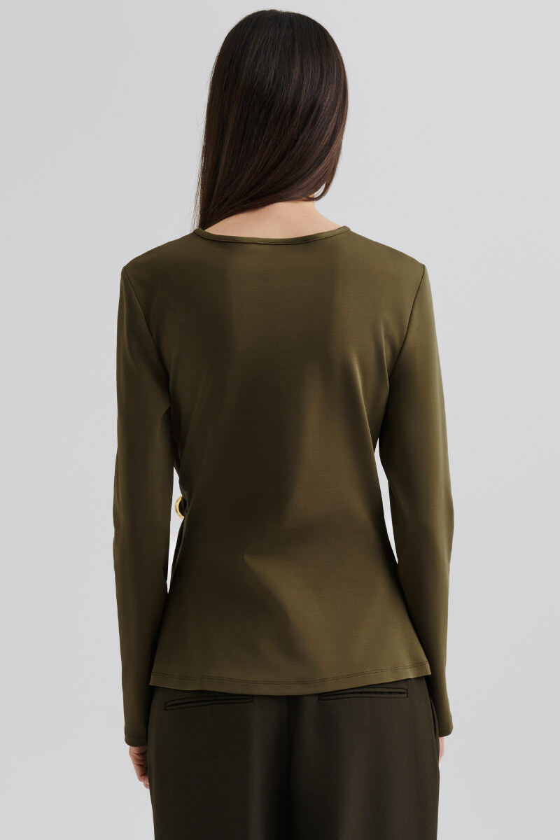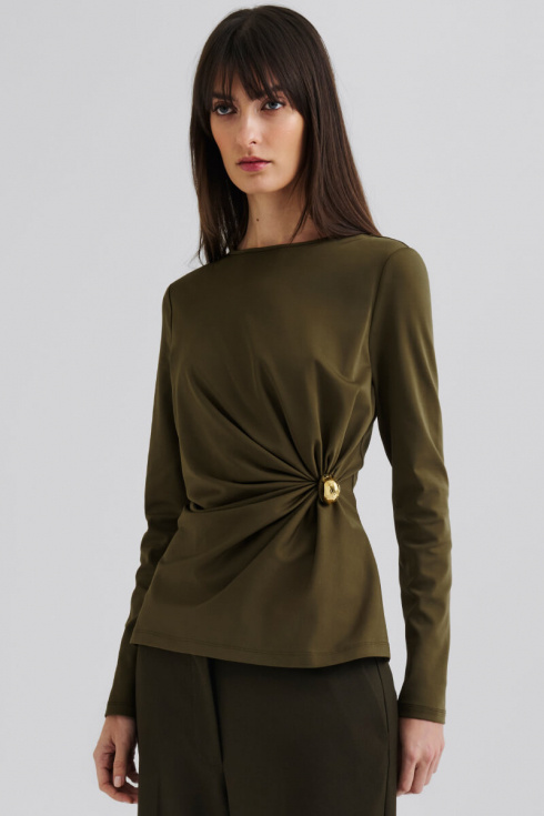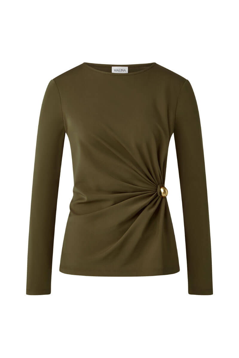 The olive green blouse in soft jersey with a slim fit, draped waist and long sleeves is both sensual and sophisticated. Style with slim leather pants and boots for evening, or combine with tailored pants and loafers for a modern everyday look.Long-sleeved jersey blouse with draped waist, high neckline and slim fit from Malina.