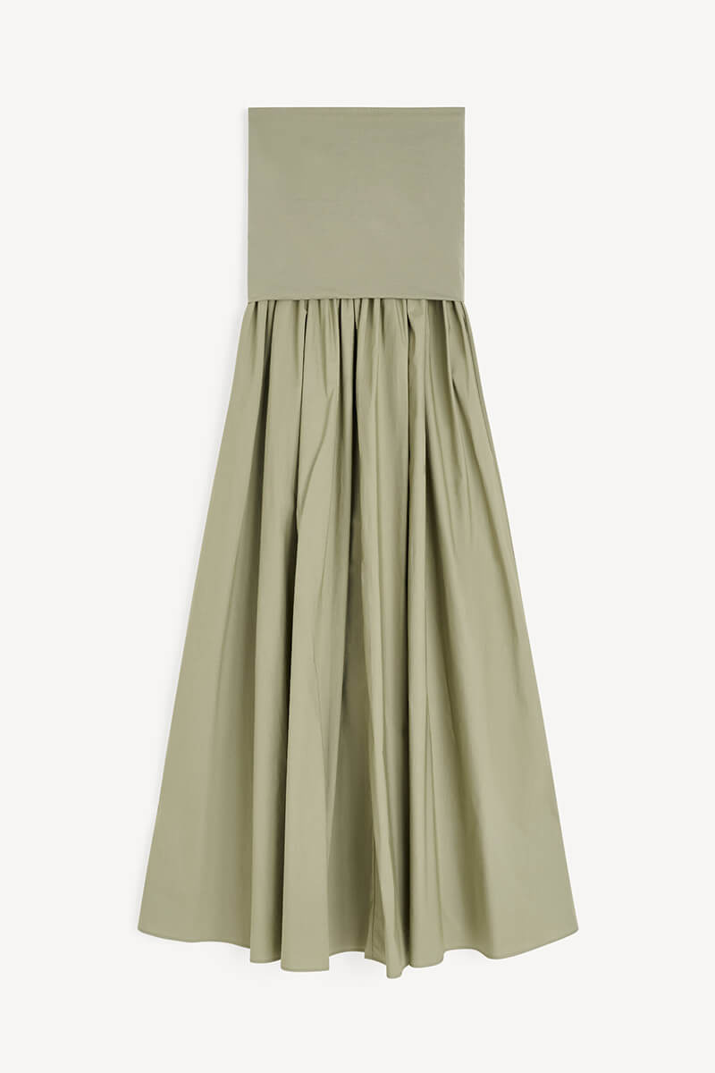 Maxi dress featuring a flexible elasticated bodice and a voluminous skirt. A versatile piece that moves beautifully and suits any summer occasion.
