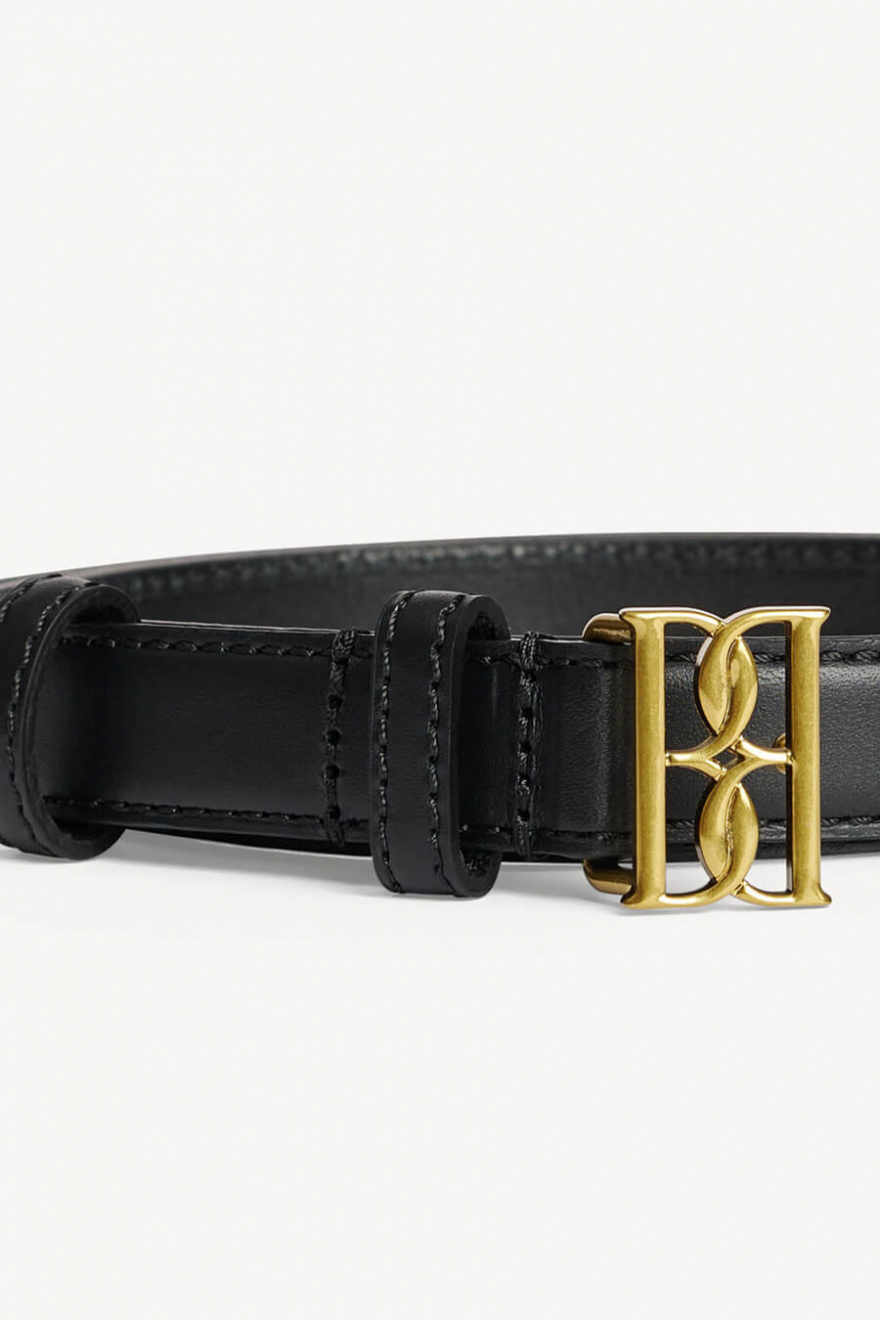 A black belt that can do it all – define the waist, lift the look and exude timeless elegance. With a sleek silhouette and a golden detail, this is the belt that takes you from everyday to evening, effortlessly but with maximum effect.Adjustable belt in leather with gold colored buckle in monogram logo from By Malene Birger.