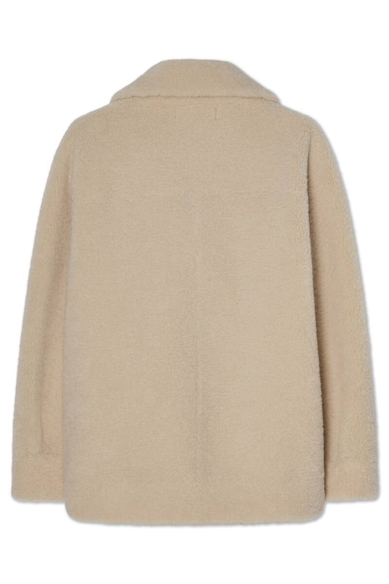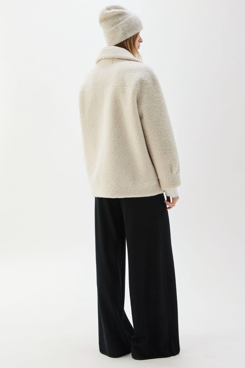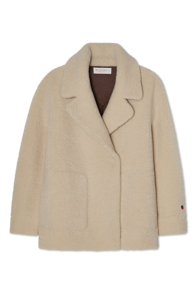 Discover the soft, luxurious ecru shearling jacket - perfect for sophisticated everyday style. Pair with slim trousers and a knitted sweater for an elegant, warm look. Stylish, timeless and versatile for every cold season.Fluffy sherling jacket with loose fit, pockets front, big collar, falling shoulder seams and embroidered logo at the end of sleeve from Busnel.