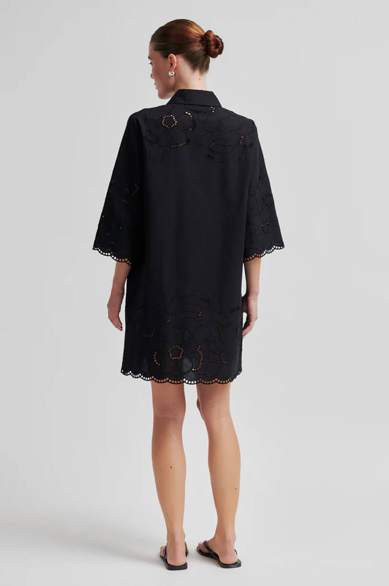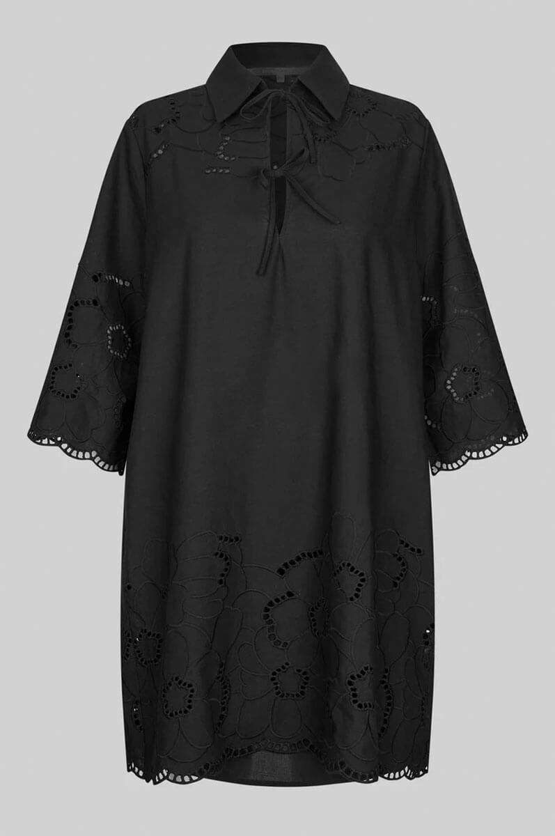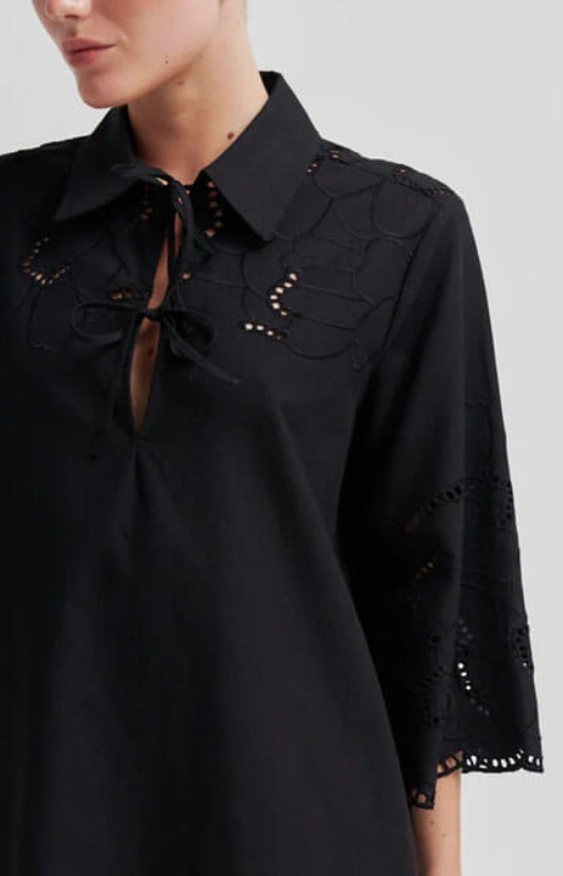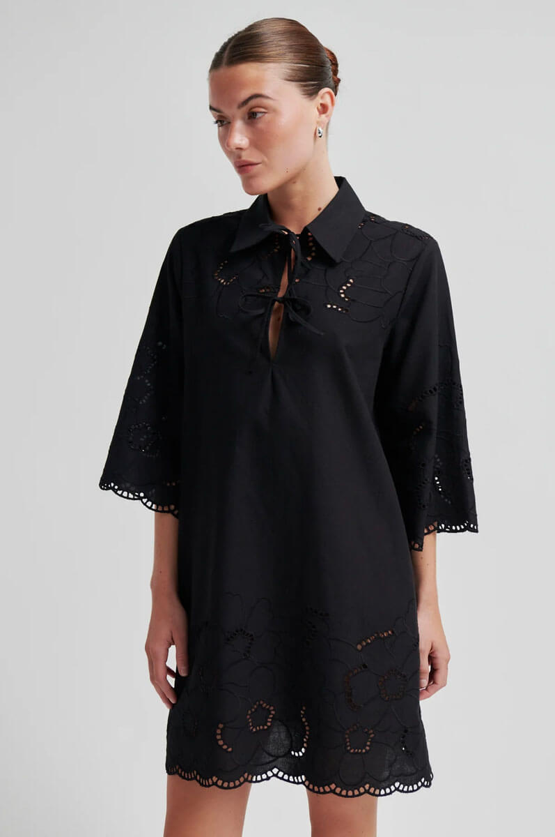 Second Female dress with lace details and cropped sleeves.The dress is made from a cotton-linen blend with cutwork embroidery. Features a tie fastening at the chest, three quarter length sleeves, and side pockets.