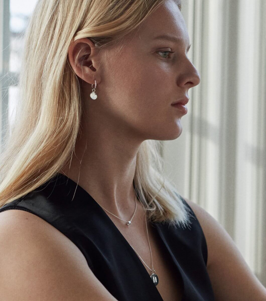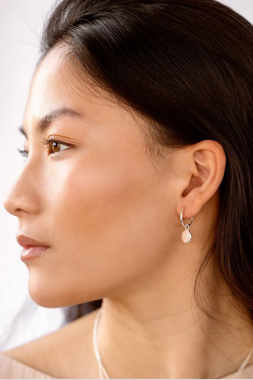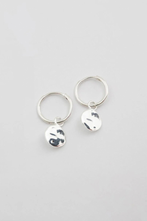Small neat earrings in 100% recycled sterling silver. The hoops have small pendants with a hammered surface. The perfect everyday earrings that enhance your outfit!Material: Sterling silver