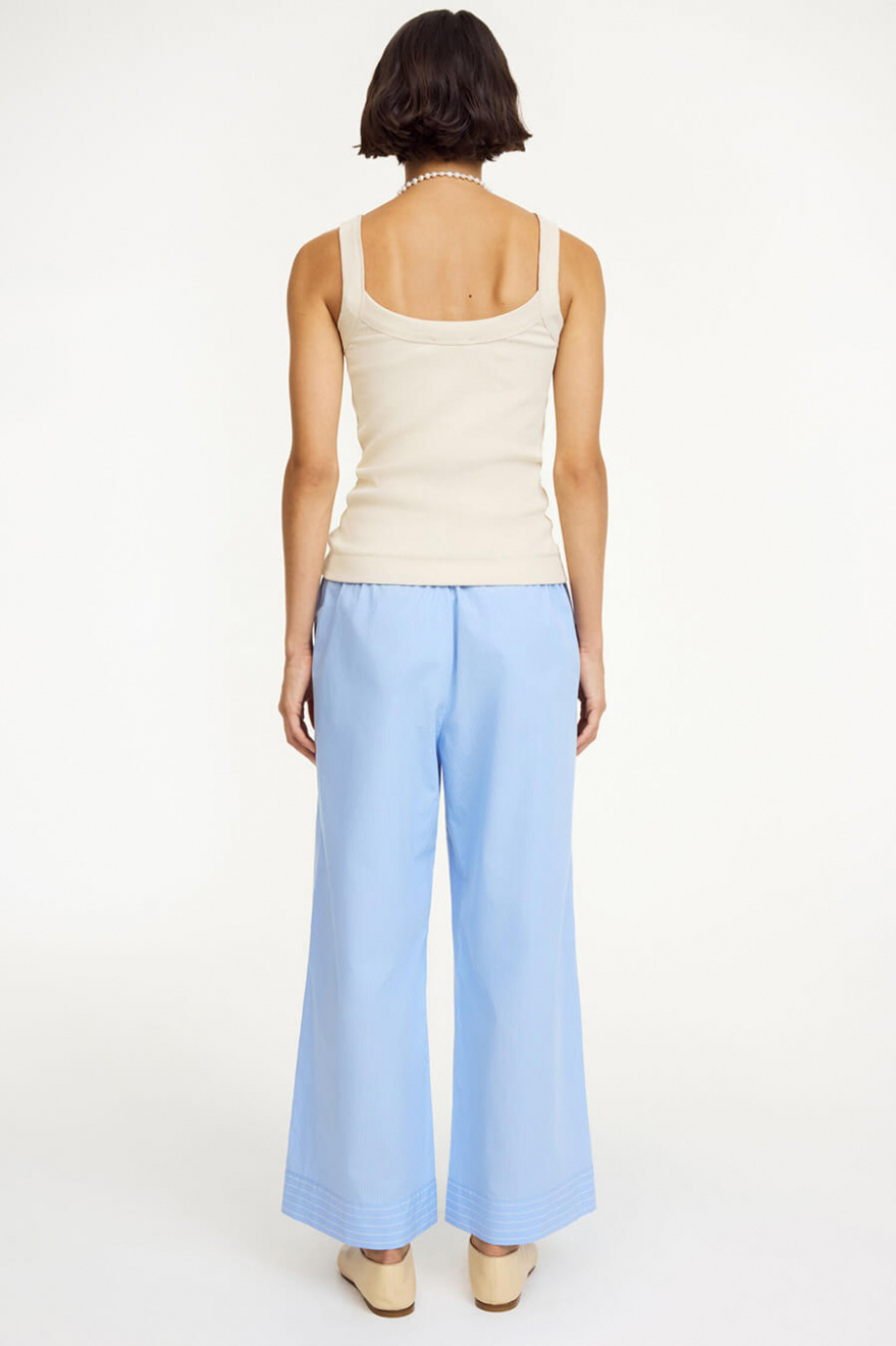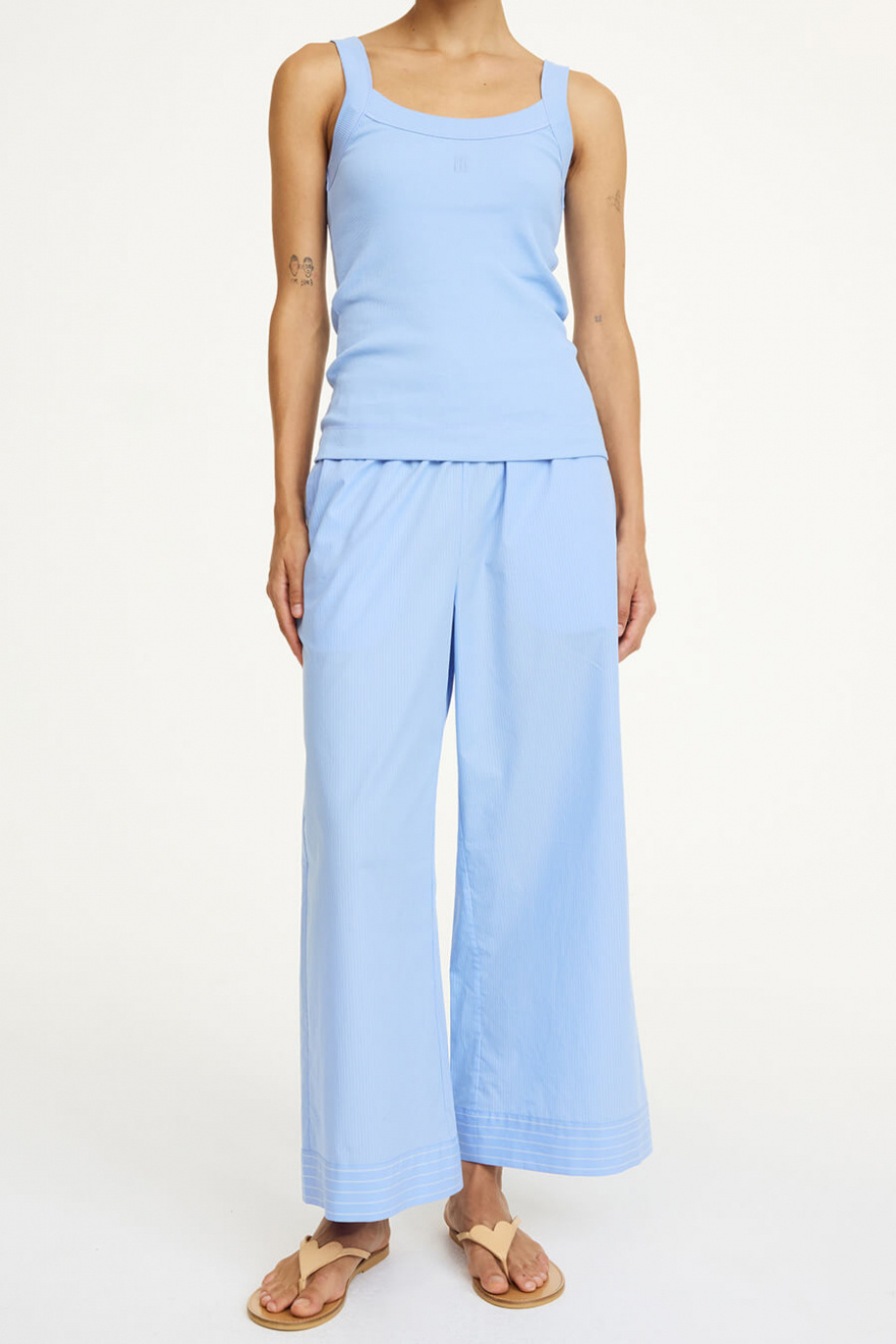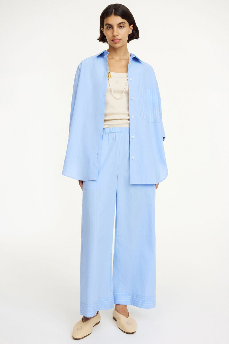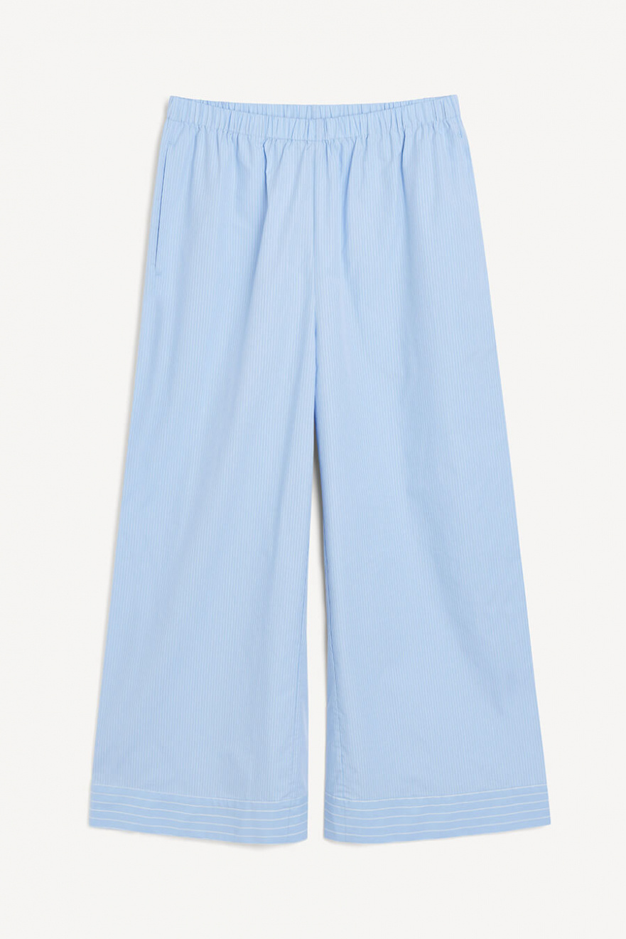 Soft, airy and the ultimate combination of comfort and style, these blue wide-leg cotton trousers with an elastic waistband work equally well with sneakers or heels. A wardrobe essential – timeless, versatile and always on point.Trousers in organic cotton with elastic waistband, pockets at the sides, wide legs and relaxed fit from By Malene Birger.