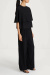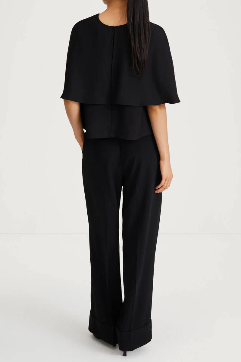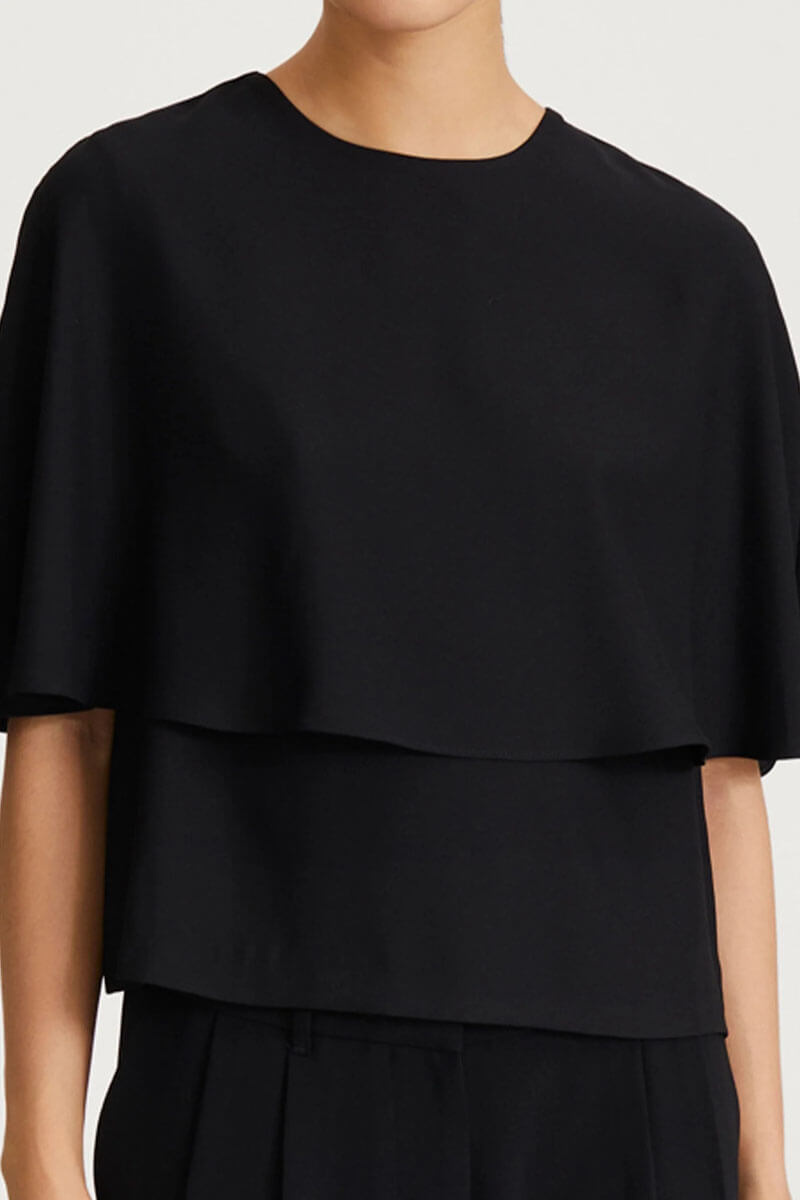 Black sleeveless top in matte crepe from Stylein, featuring a boxy fit, cropped length, and cape-inspired overlay.- True to size