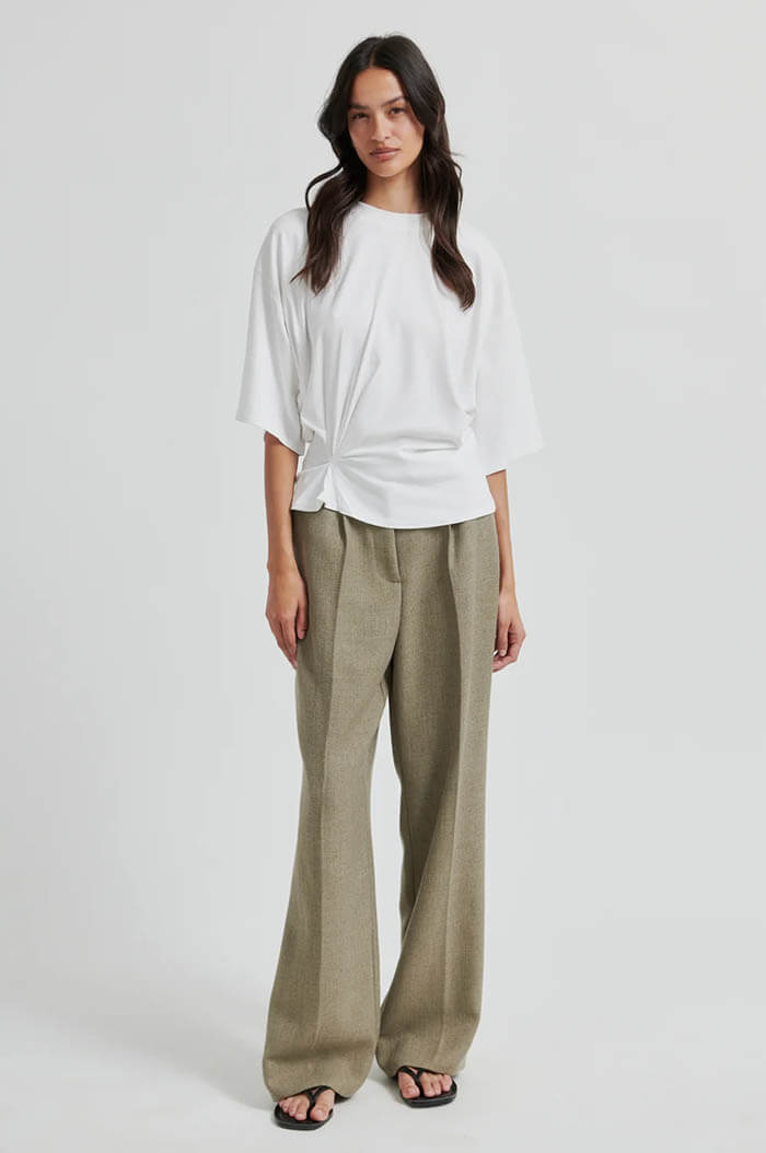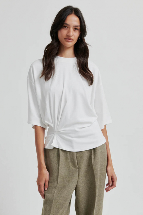 The white top with a subtle twist at the front will be an obvious pop of color in your wardrobe. The short, wide sleeves give a light and casual feel, perfect for both everyday and evening wear. A stylish garment with attitude – always right.T-shirt in soft cotton blend with a round neckline, short sleeves, dropped shoulder seams and a draped detail at the side from Second Female.