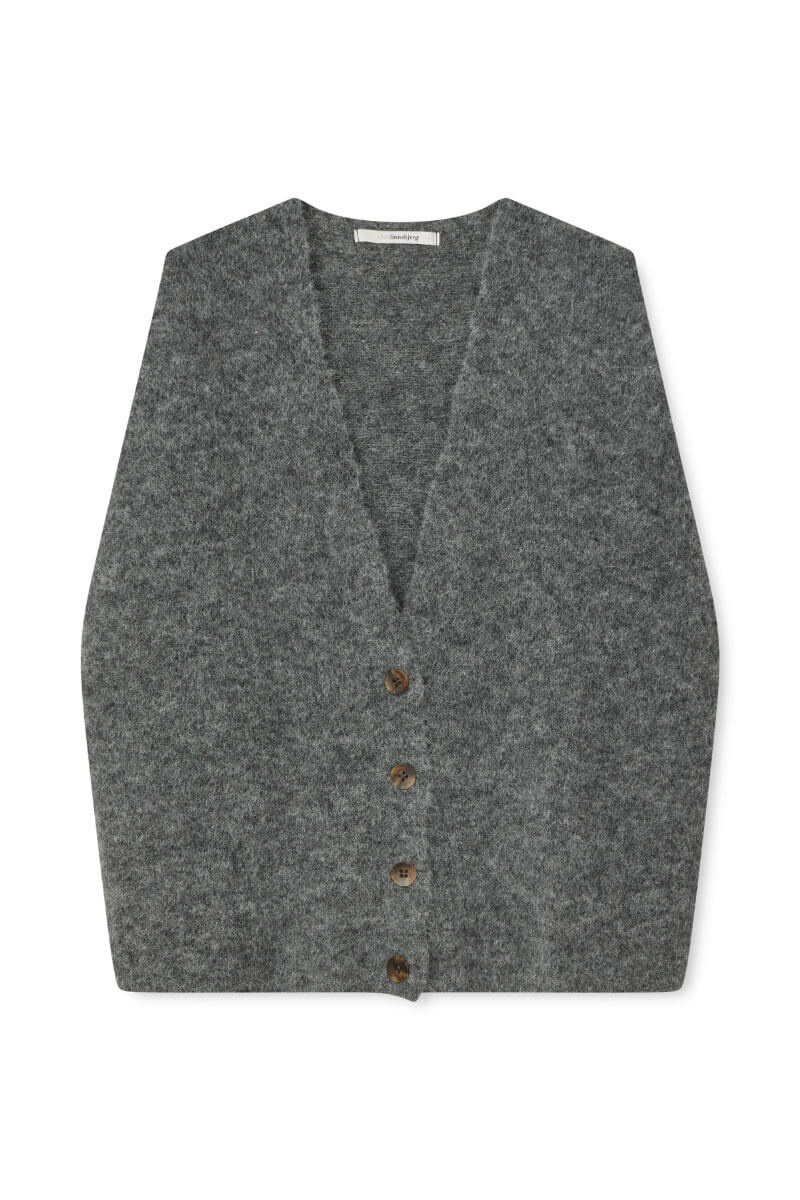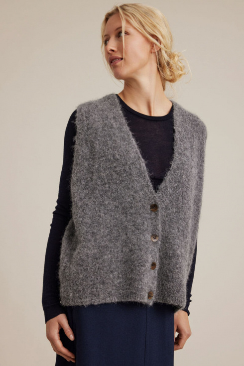 A loose-fitting knit vest in a fluffy alpaca blend with a V-neck is the season's most versatile layer. Wear it buttoned up over a white shirt with straight-leg jeans, or with suit trousers for a sophisticated everyday look.Knitted vest in a fluffy alpaca blend with v-neckline, loose fit, ribbknitted edge at the bottom and button closure front from Sibin Linnebjerg.
