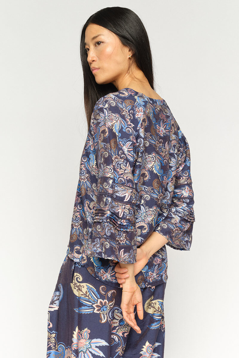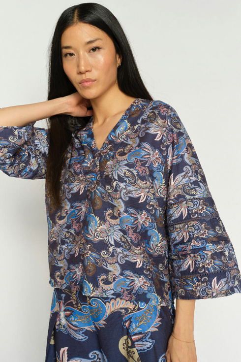 The elegant blue paisley print adds a timeless yet modern feel, making it an easy choice for both everyday wear and more dressed-up occasions.