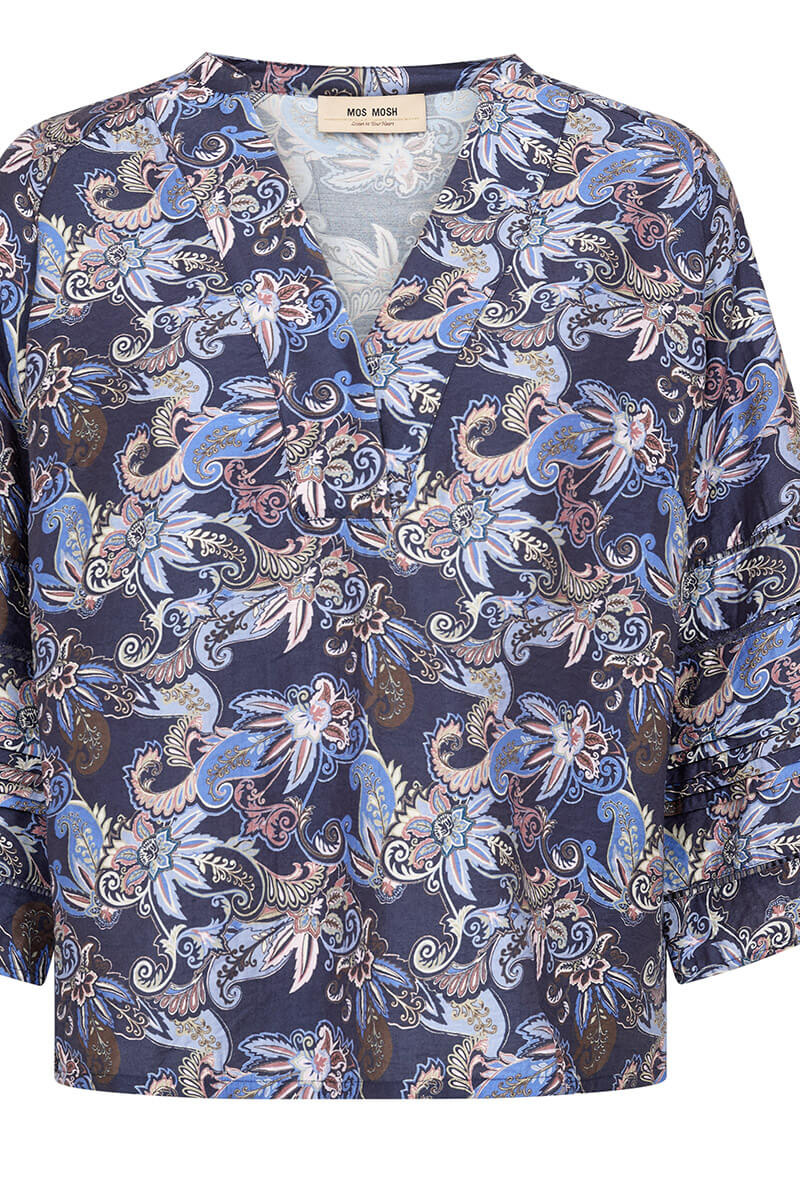 This beautiful blouse from Mos Mosh features a flattering V-neckline, 3/4-length sleeves, and a relaxed silhouette that drapes effortlessly on the body.