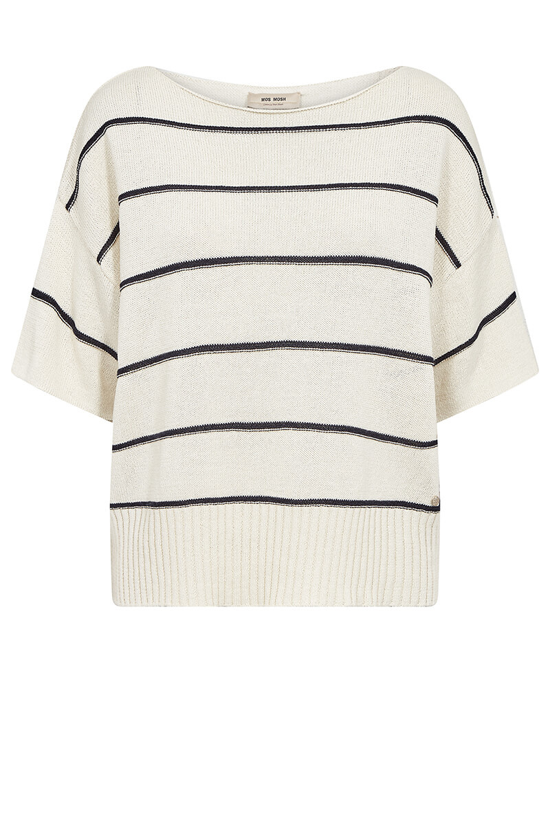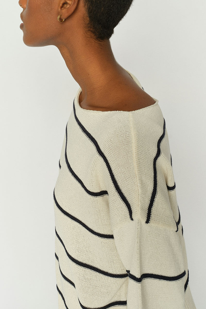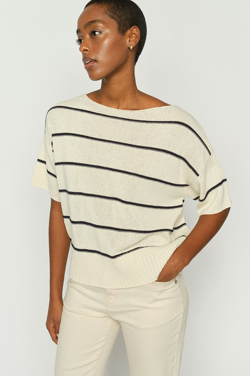 Lightweight knits are always a stylish choice in a cool, breathable quality. Pair it with linen trousers or a skirt for an effortless, elegant look.This short-sleeve knitted top features a modern boat neckline and a horizontal striped pattern. Crafted from a soft blend of organic cotton, viscose, and paper, it offers an airy texture and a relaxed silhouette—perfect for an easy yet refined everyday style.