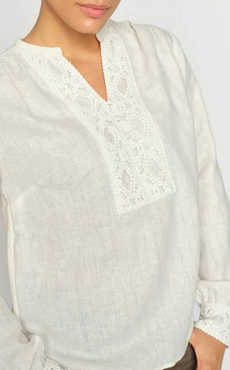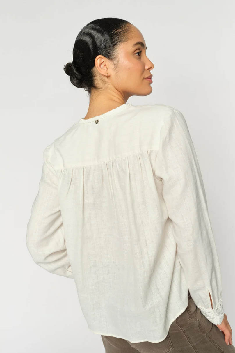 A beautifully detailed blouse in a soft linen-cotton blend. Designed with a relaxed silhouette and delicate broderie anglaise along the neckline and sleeve cuffs, adding a feminine elegance to the natural fabric. Perfect with tailored trousers or denim for a casually elegant look.