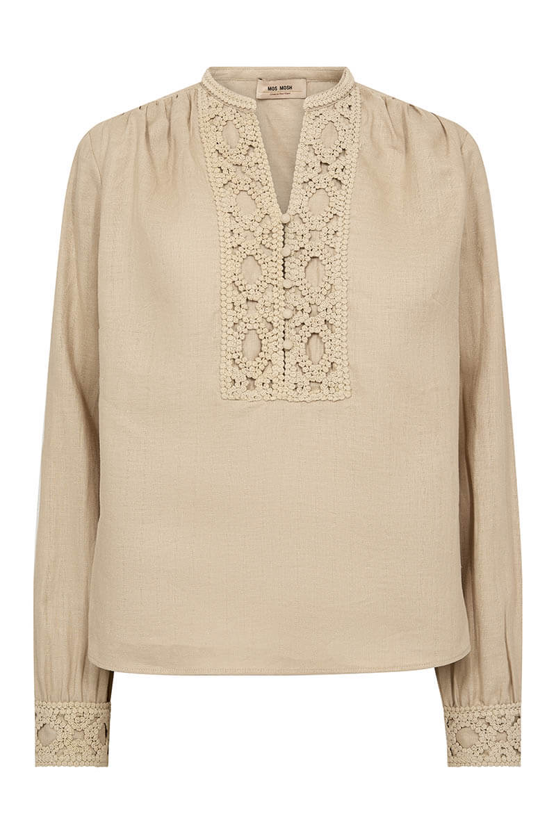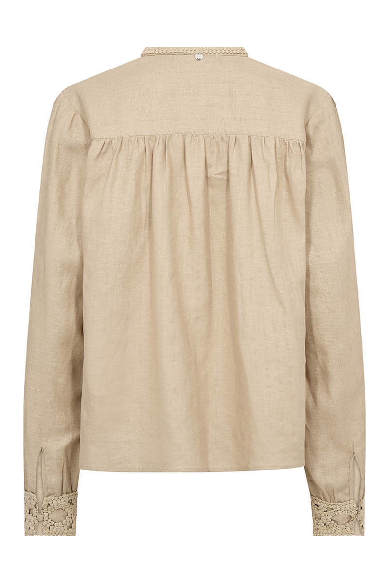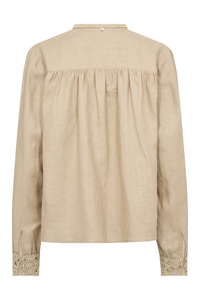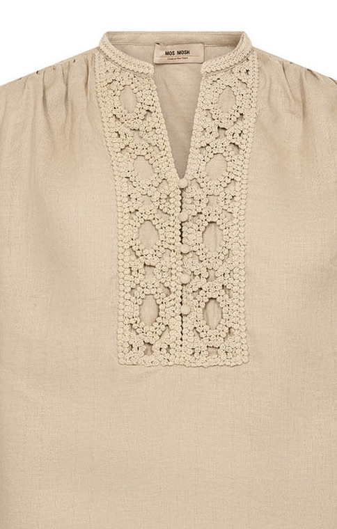 A beautifully detailed blouse in a soft linen-cotton blend. Designed with a relaxed silhouette and delicate broderie anglaise along the neckline and sleeve cuffs, adding a feminine elegance to the natural fabric. Perfect with tailored trousers or denim for a casually elegant look.