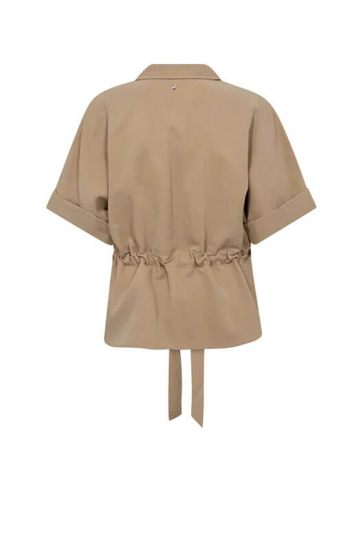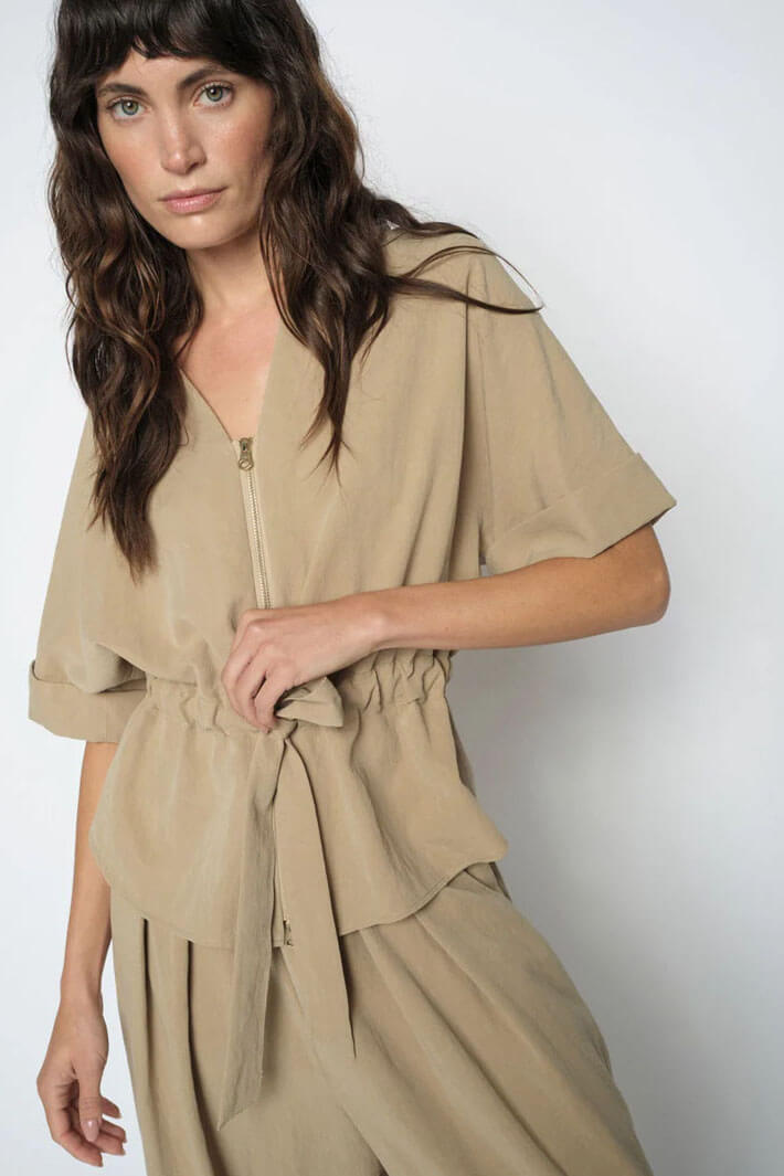 Blouse with short sleeves, collar, zipper, and adjustable waist in a soft and flowing material.- True to size, adjustable fit