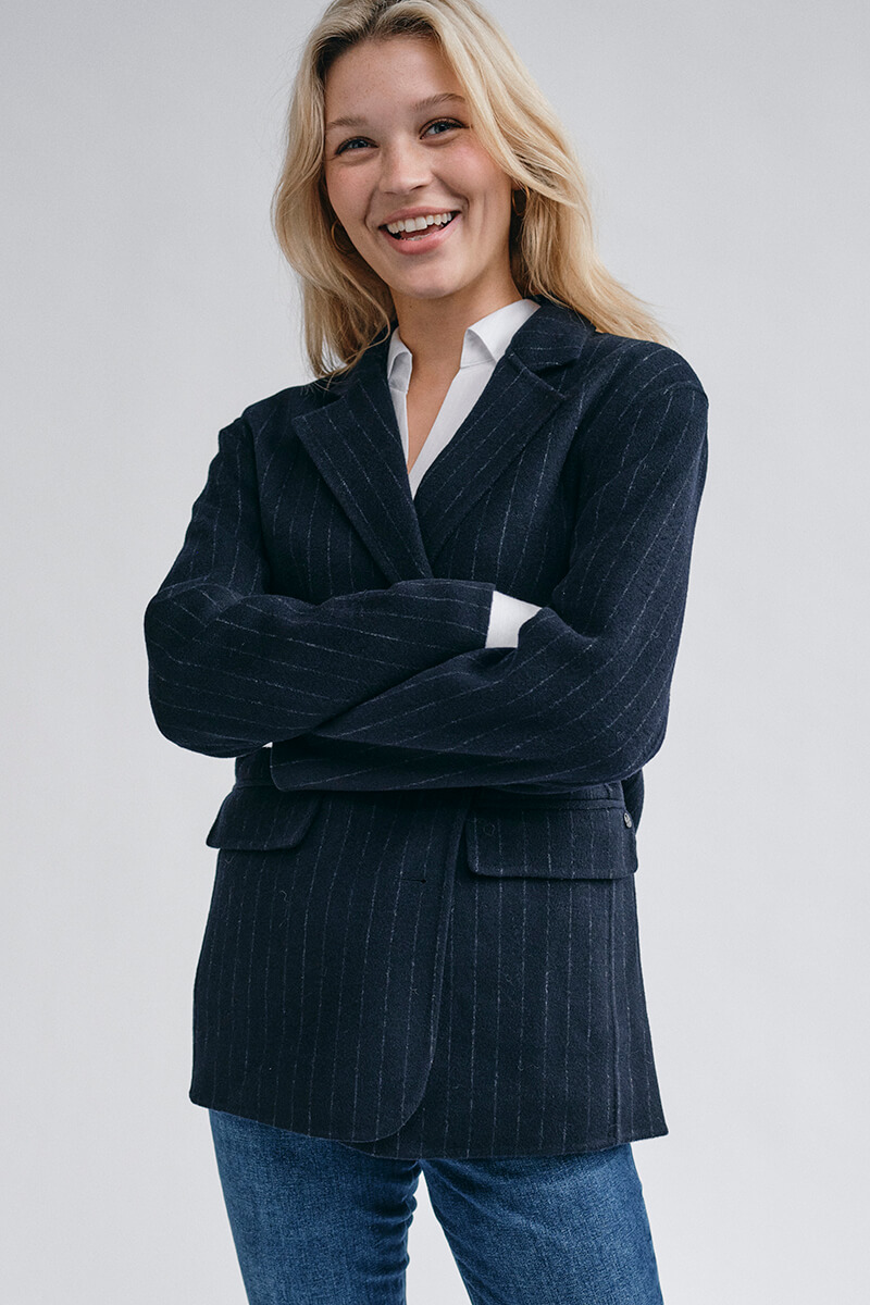 A soft and elegant wool blazer that completes any outfit. The subtle pinstripe pattern adds a timeless touch, making it just as stylish with relaxed jeans as with tailored trousers.