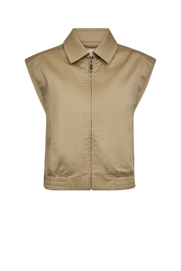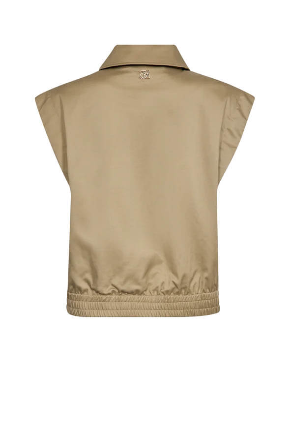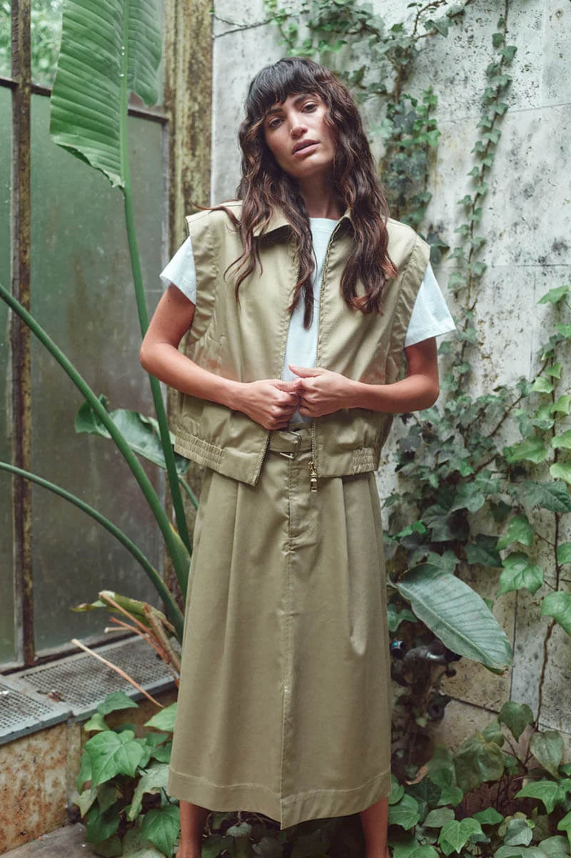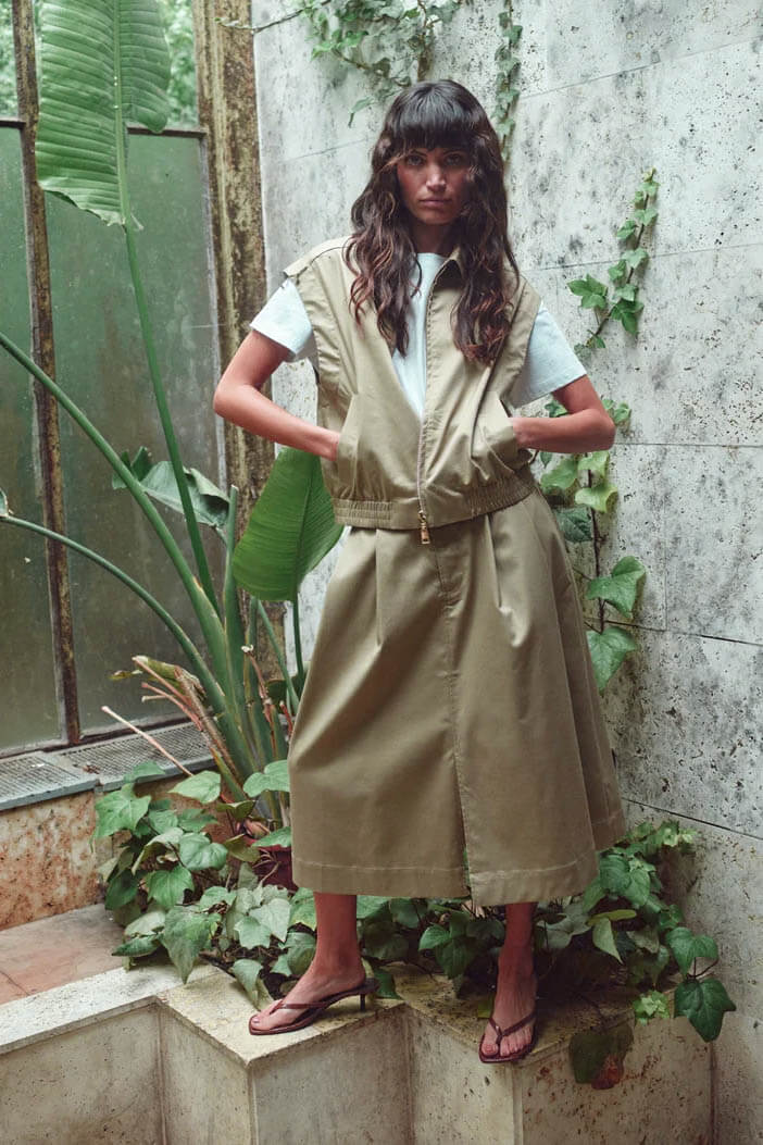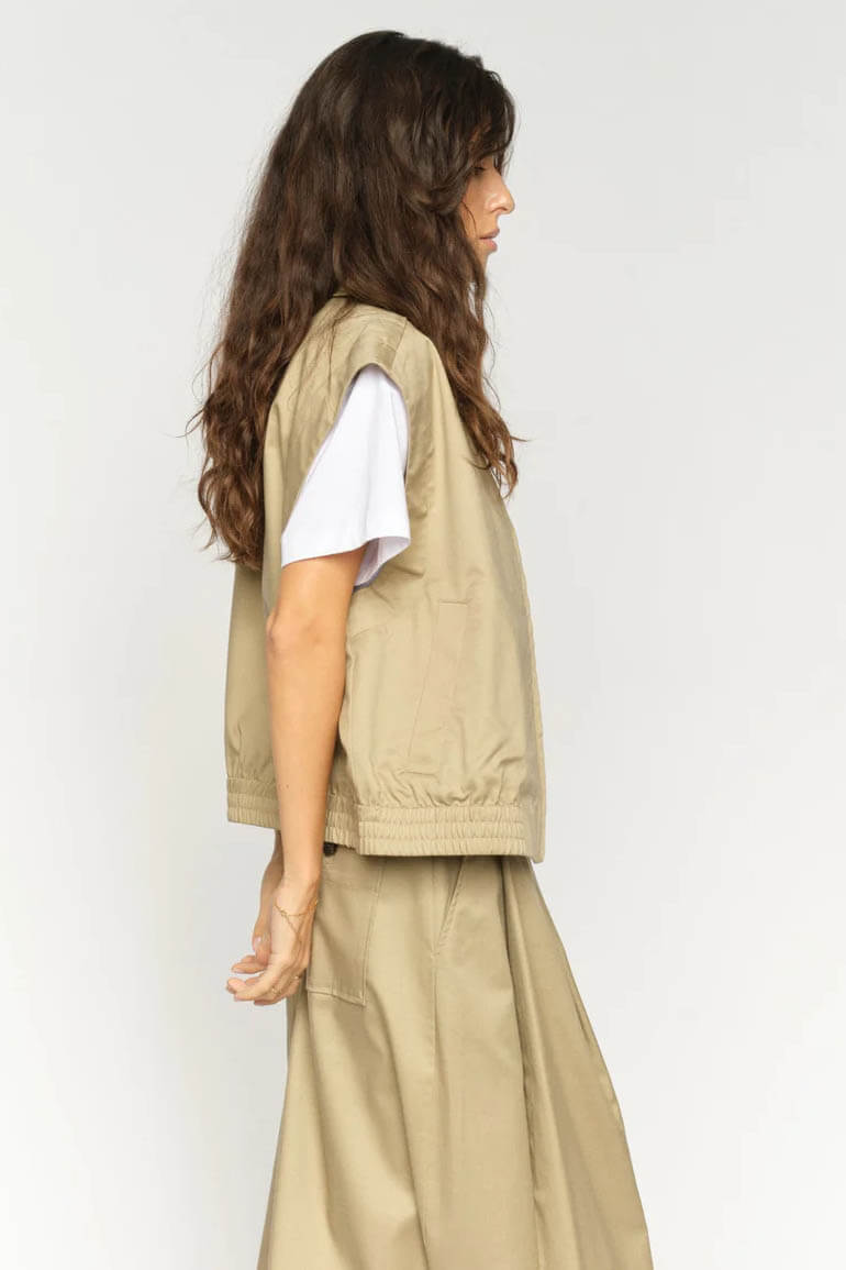The vest that completes your outfit. With its cool silhouette and elegant beige tone, this piece is perfect styled with the matching skirt or paired effortlessly with your favorite jeans this spring.