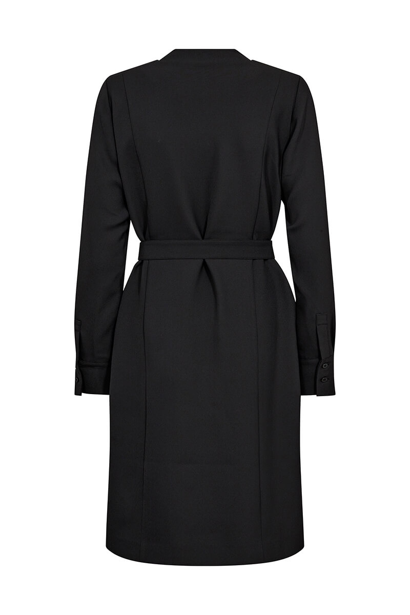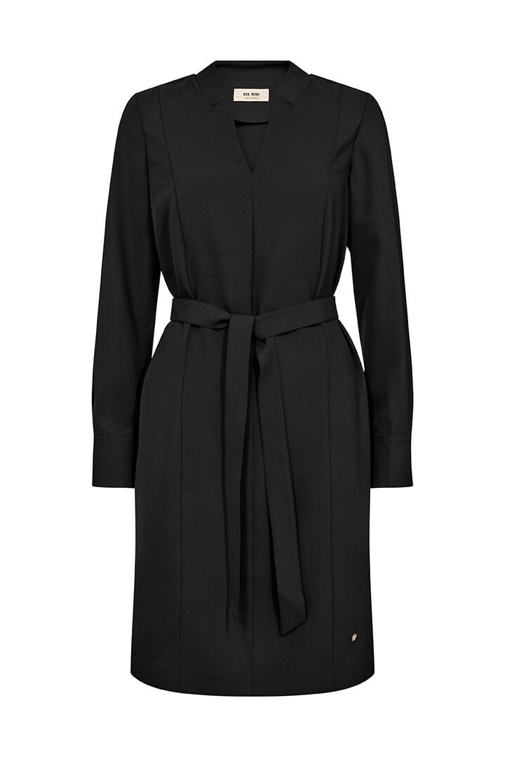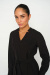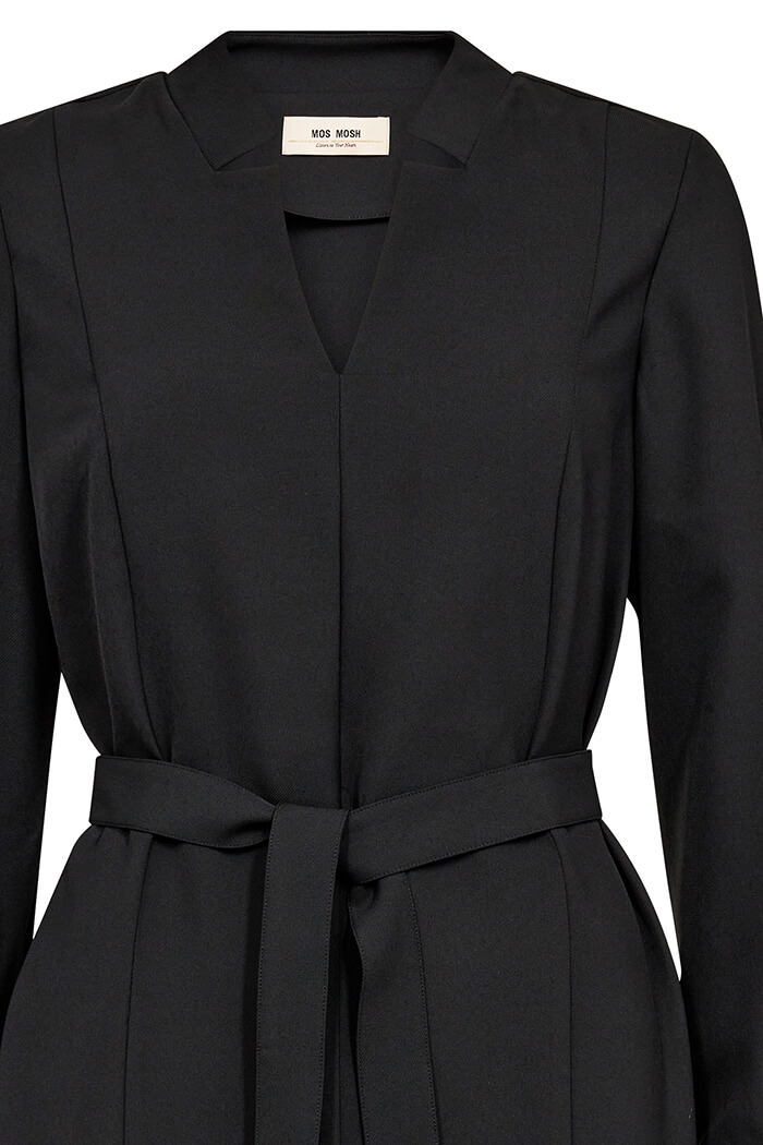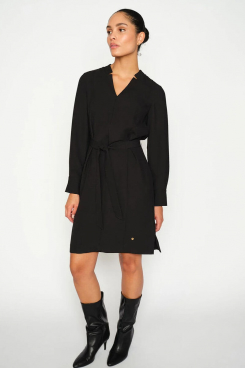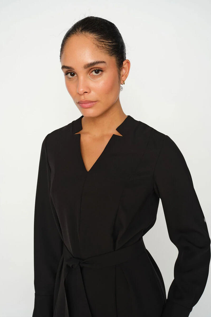 This dress is designed in a sleek silhouette with long sleeves,a clean V-neckline, and flattering panel details. It’s crafted from a soft, structured fabric that drapes beautifully and ties at the waist for a feminine shape. The detachable belt lets you style it your way