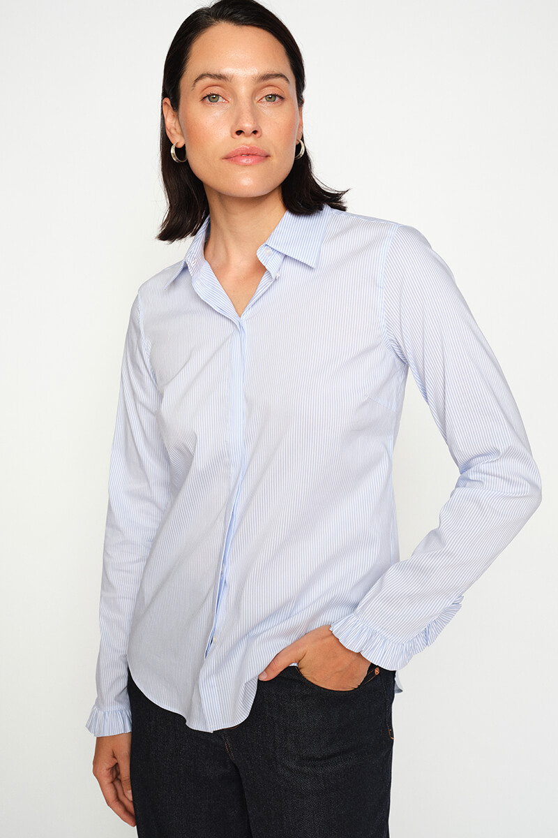 Blouse with a feminine feel in soft stretch.This model features a flattering, slim silhouette and is made from an ultra-soft, stretchy fabric. With a classic collar, elegant ruffled cuffs, and timeless front buttons, it quickly becomes a wardrobe favorite. Pair it with tailored pieces and let the charming ruffled cuffs subtly peek out from under the sleeves.