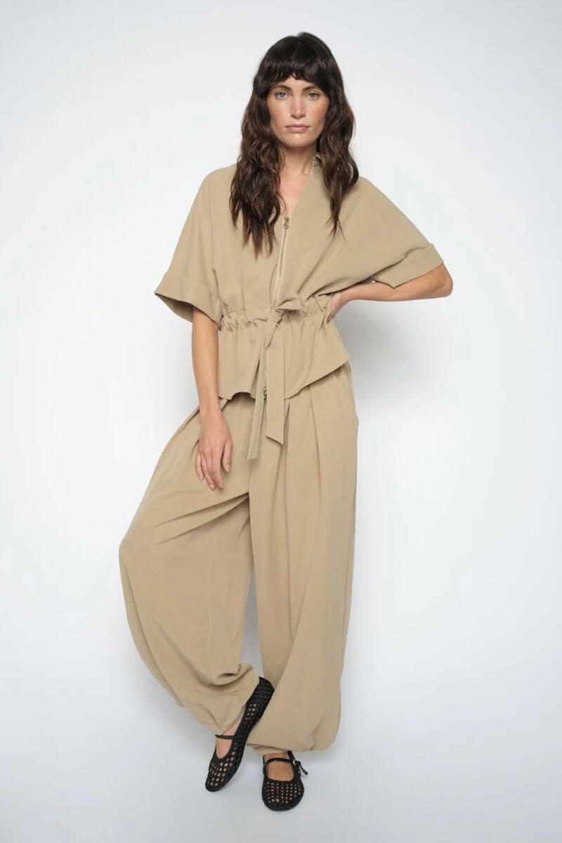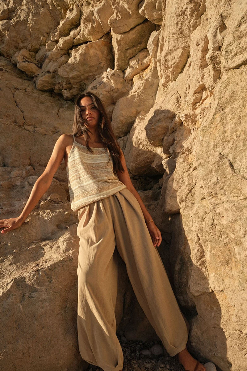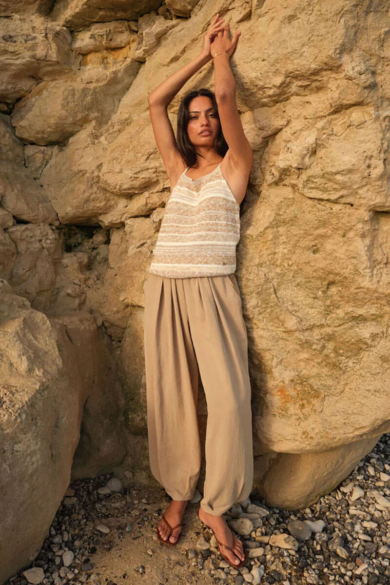 These soft trousers feature an elasticated waistband and a relaxed boyfriend fit.The lightweight fabric feels comfortable, while the ankle-length cut makes them easy to style for everyday wear and casual looks. Pair them with a simple top or the matching vest in the same quality.