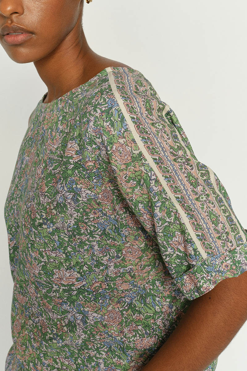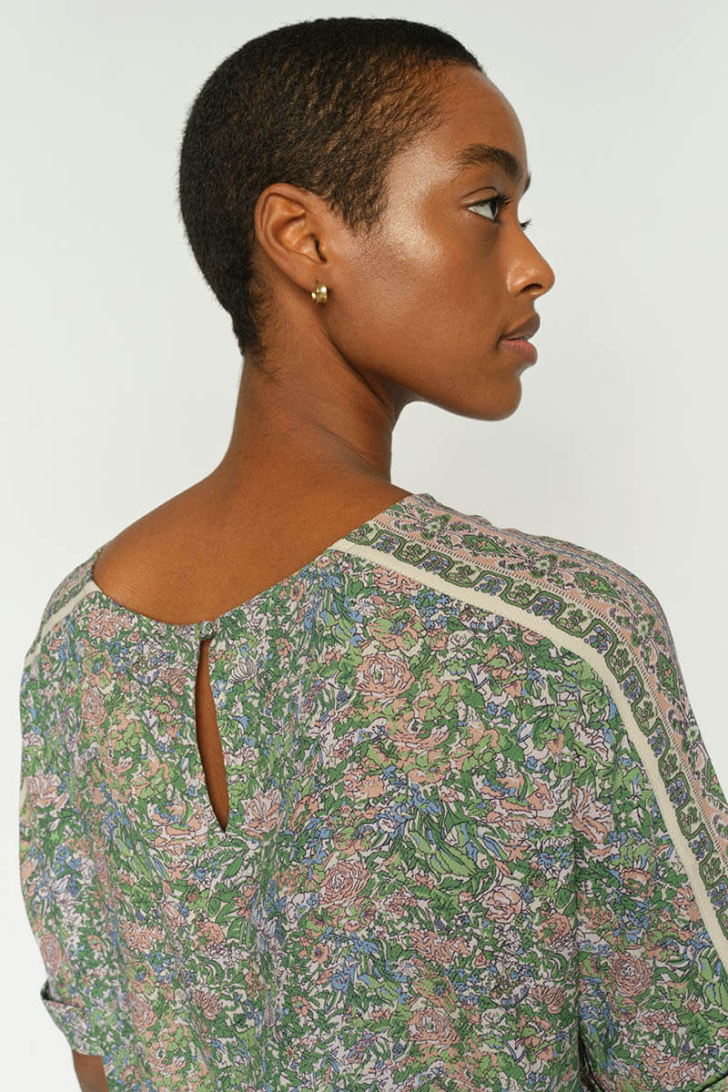 The blouse features a beautiful green pattern, 3/4-length sleeves, and a delicate button detail at the back of the neck for a sophisticated touch. Designed in a regular fit, making it easy to wear and style – ideal for both everyday looks and more dressed-up occasions.