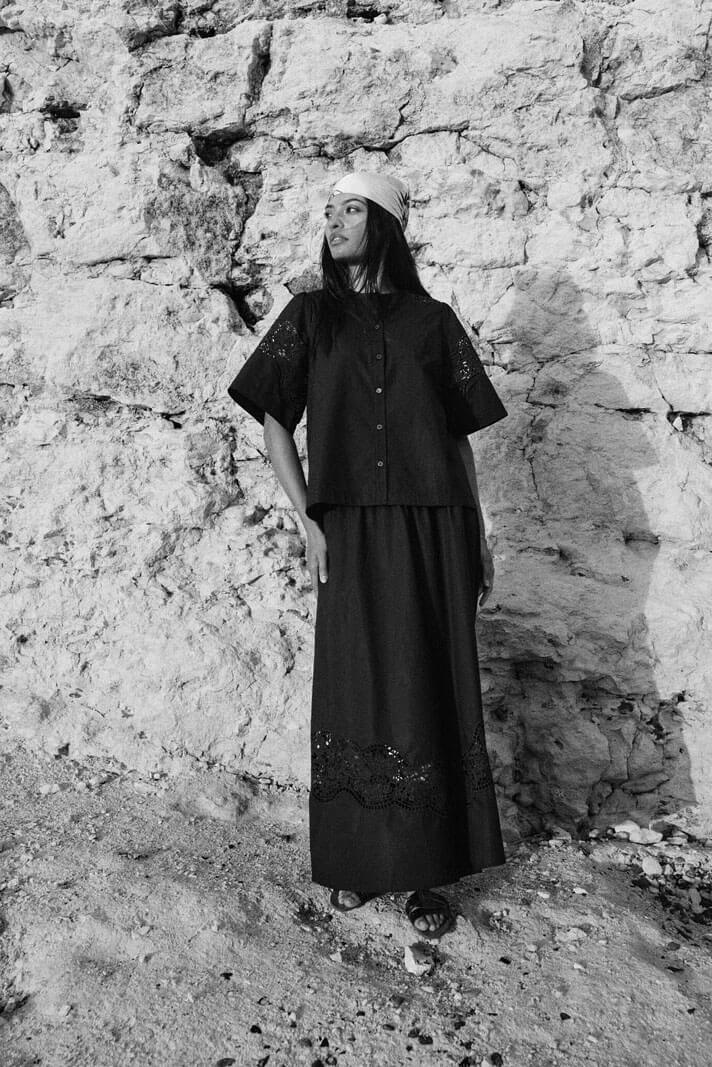 This feminine long skirt features an elasticated waistband for a comfortable fit. Elegant embroidered details add a refined touch, while the clean silhouette makes it easy to style for everyday wear and relaxed occasions.