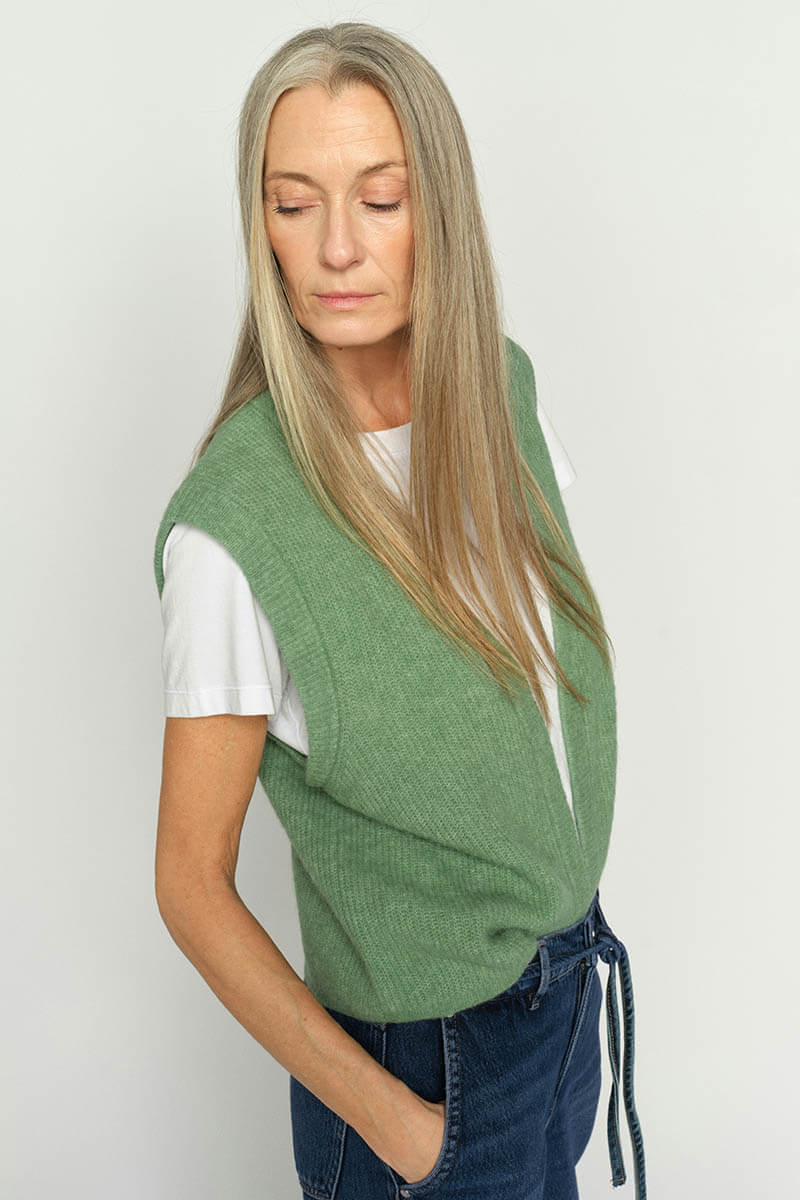 This timeless knitted vest is crafted from a soft and cozy blend of wool and alpaca, offering both comfort and elegance. Designed with a relaxed silhouette and an open front, it’s perfect for layering over shirts or dresses. A versatile wardrobe essential that adds texture, structure, and effortless sophistication to any outfit.
