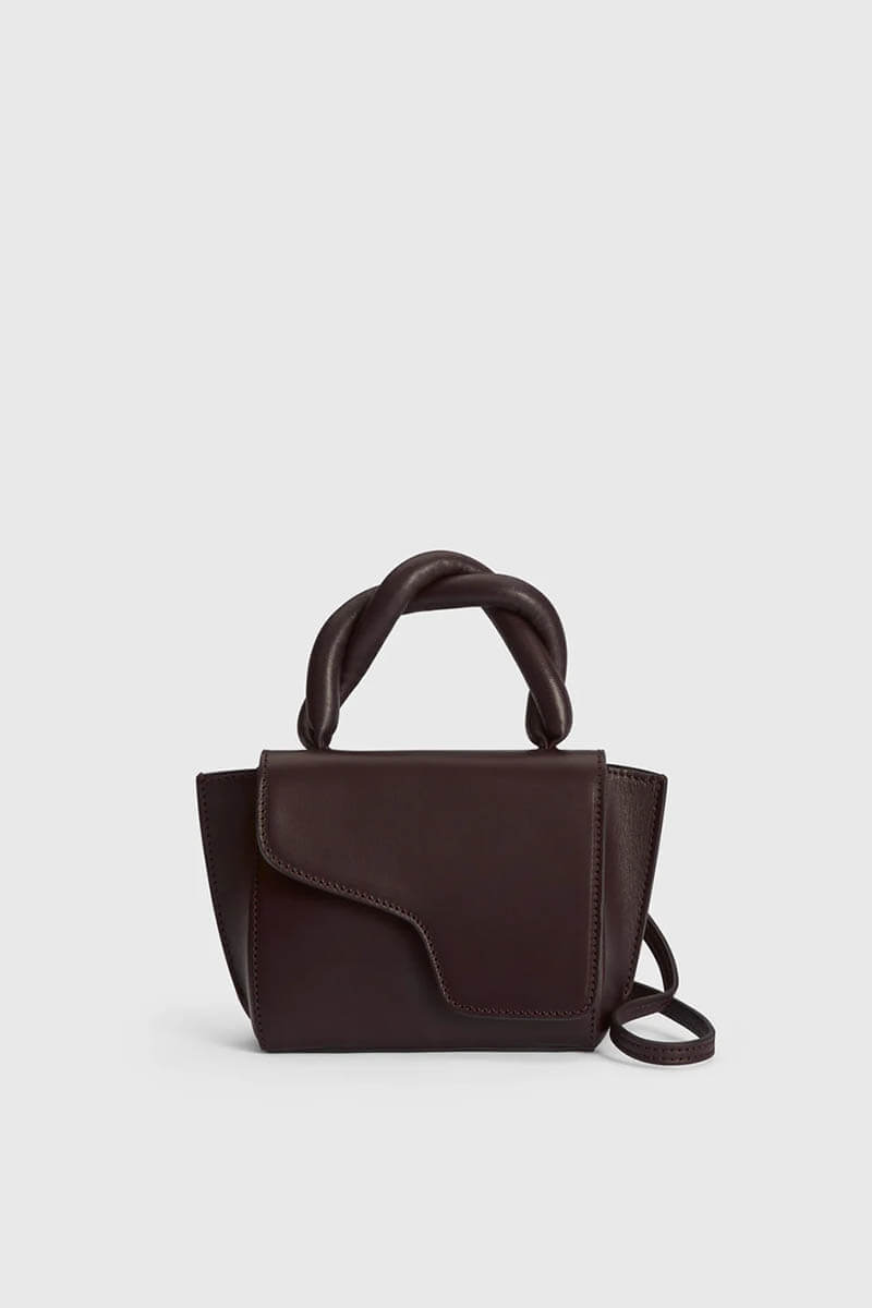 Mini handbag with top handle, removable crossbody strap, flap with magnetic closure, and gold-tone hardware. Finished with hand-painted edges in a tonal shade.