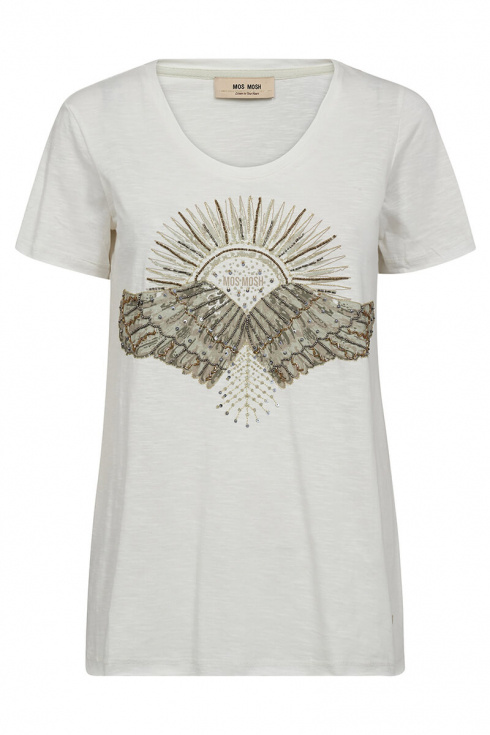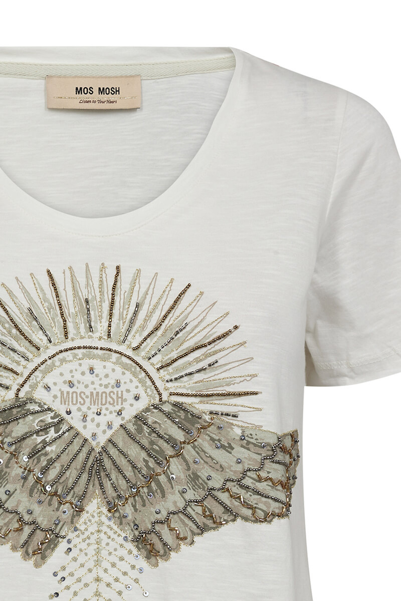 A statement tee that gets the job done. Perfectly rounded neckline, just the right relaxed fit and a print with decorative beads add that little extra. Style with straight jeans or a denim skirt – ready in no time.T-shirt in cotton with round neckline, short sleeves and embroidered print with pearls and sequin from MosMosh.