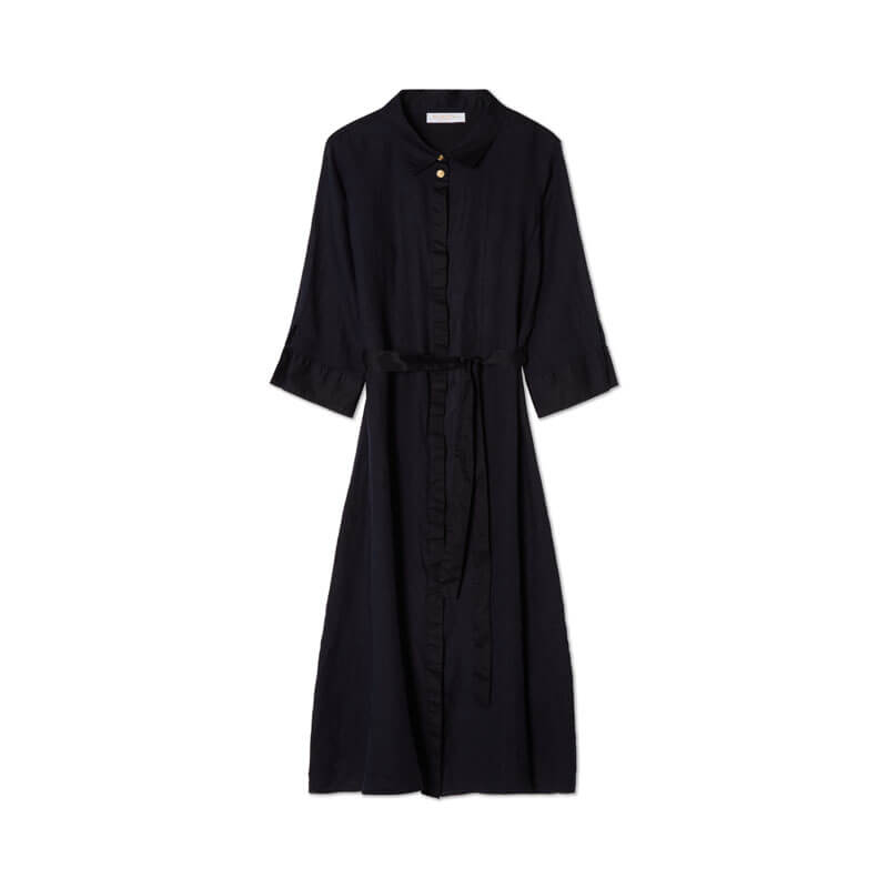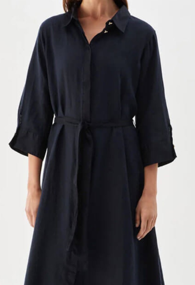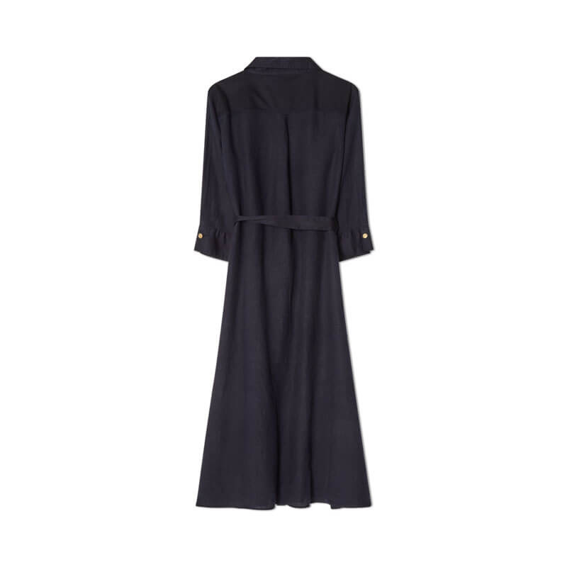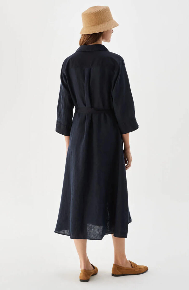 This shirt dress features a classic fit with a tie belt at the waist, a classic collar, a concealed button placket, and short sleeves with a turned-up cuff. Small details such as gold buttons at the top of the collar and on the cuffs give this linen dress an exclusive and timeless look. The dress is highly versatile and works beautifully for both everyday wear and special occasions. We love styling it with a feminine heel or a pair of ballet flats.