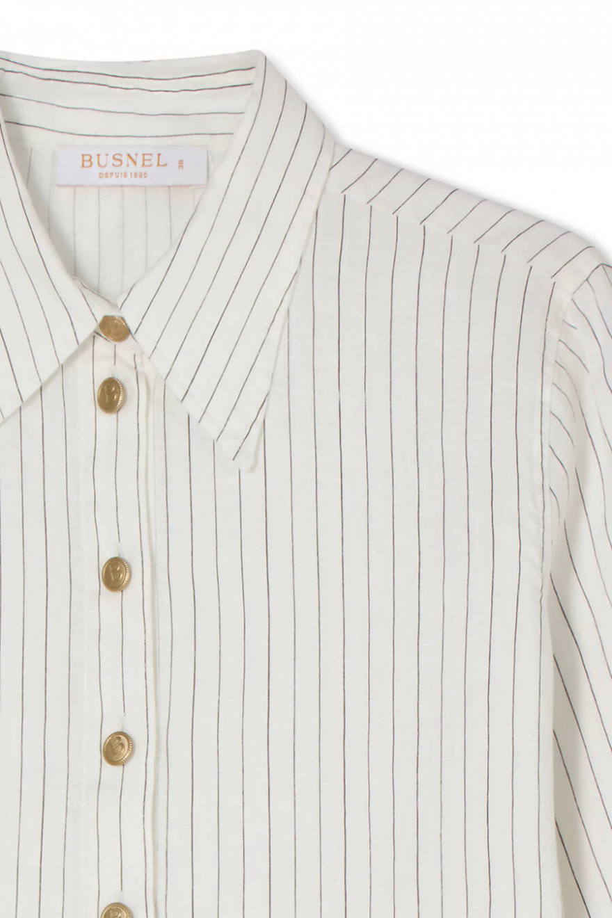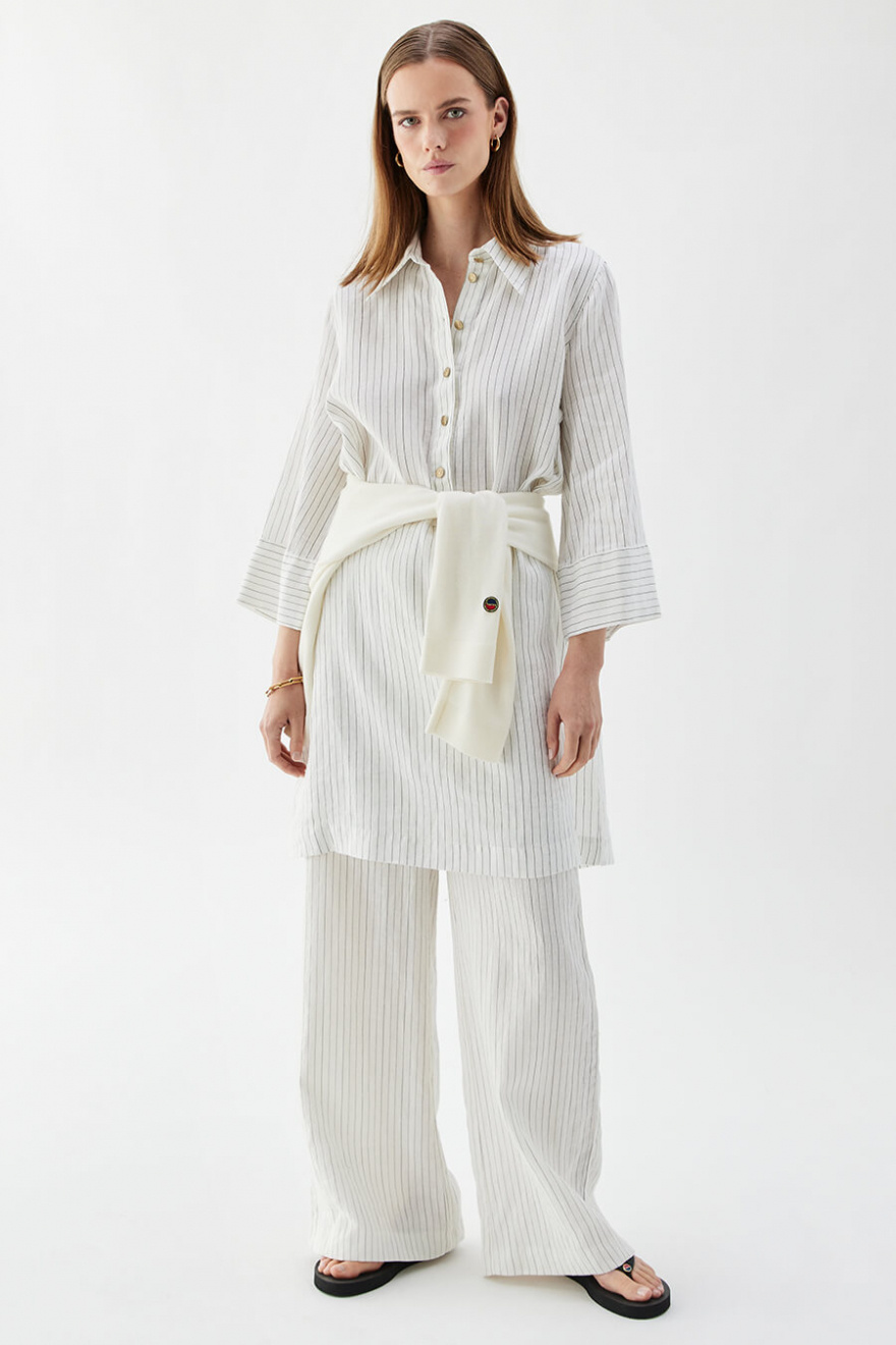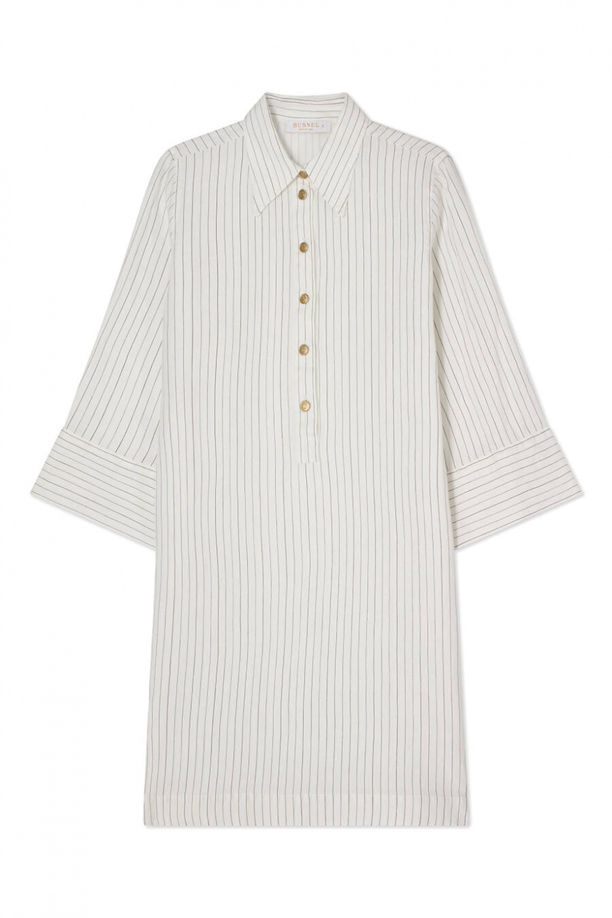 A white linen dress with black stripes that combines style with ease. The wide sleeves give a casual feel, while the golden buttons add an elegant detail. Perfect for sunny days in the city or long lunches by the sea.Dress in linen with loose fit, A-shape, short wide sleeves, button closure front and classic collar from Busnel.
