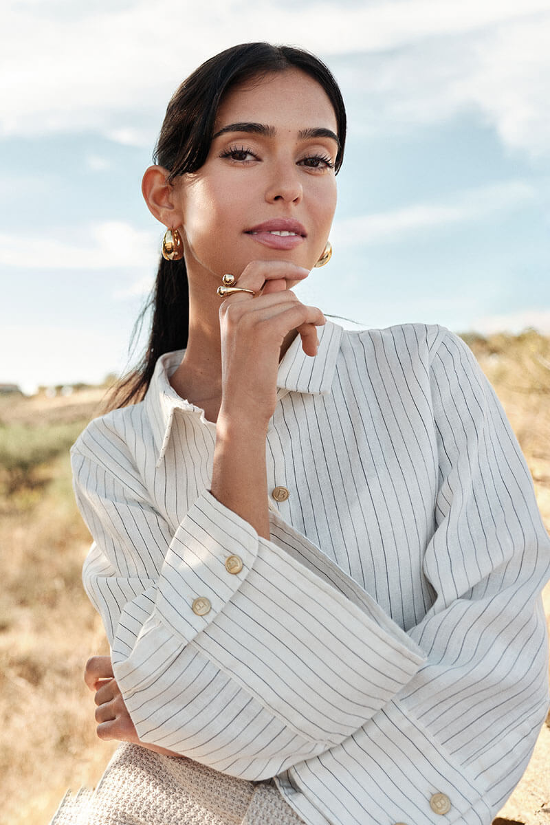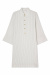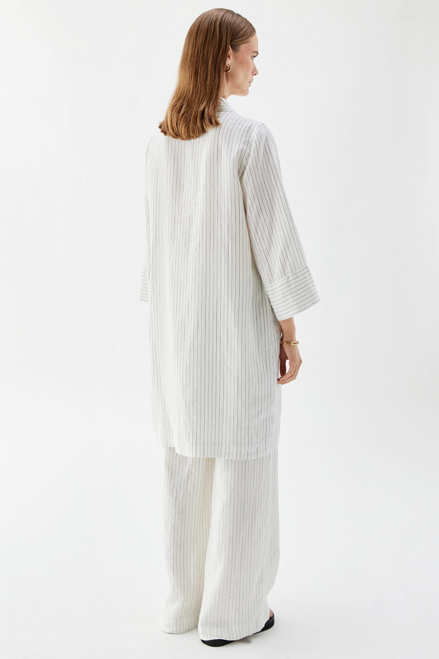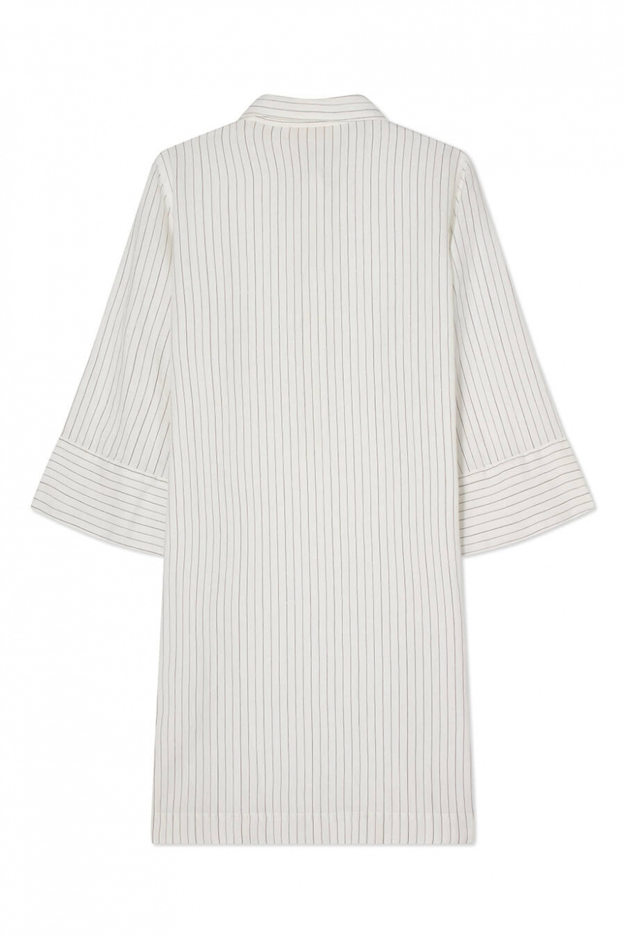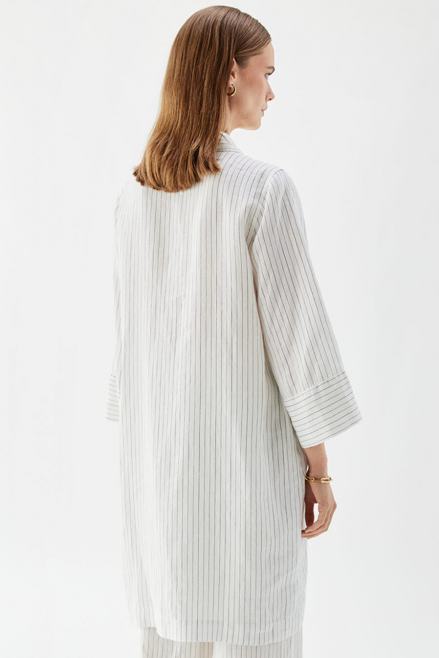 A white linen dress with black stripes that combines style with ease. The wide sleeves give a casual feel, while the golden buttons add an elegant detail. Perfect for sunny days in the city or long lunches by the sea.Dress in linen with loose fit, A-shape, short wide sleeves, button closure front and classic collar from Busnel.