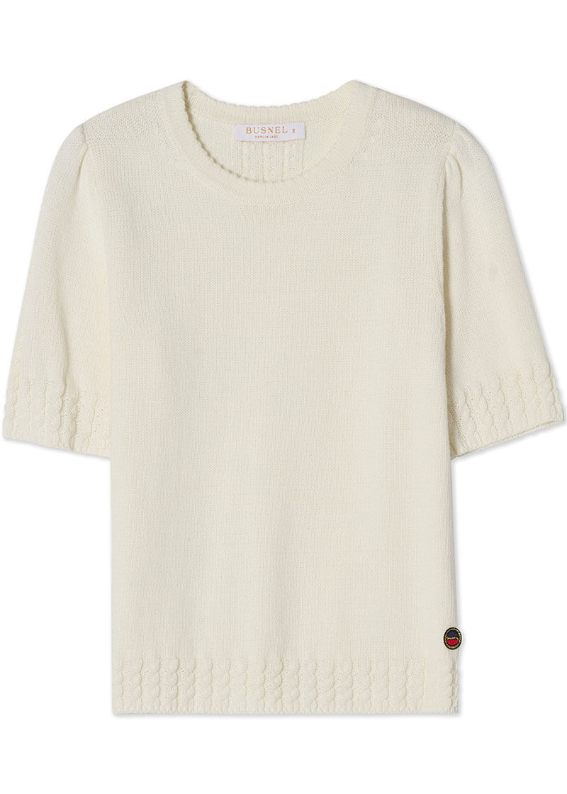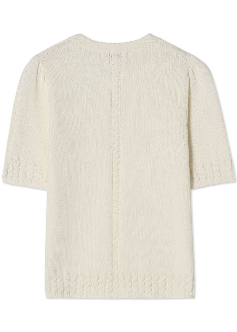 The top features decorative cable-knit details at the sleeve cuffs and hem, creating a timeless and feminine look, while the slightly puffed sleeves add a modern silhouette.