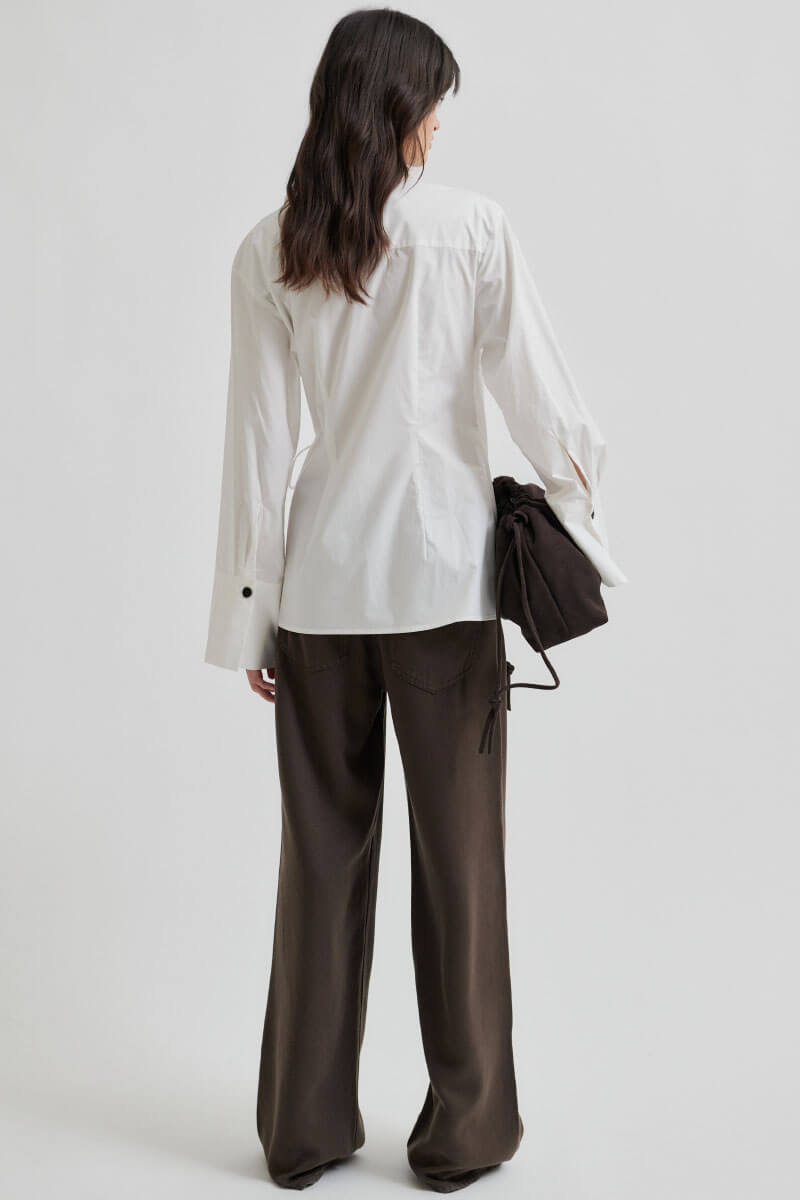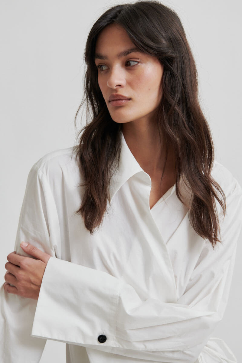 Crisp white shirt with a wrap design and classic collar. Perfect with straight jeans for a modern everyday look, or with tailored trousers and statement earrings for a stylish, conscious evening outfit.Shirt in a crispy organic cotton with tie at the side, collar, relaxed fit and cuffs from Second Female.