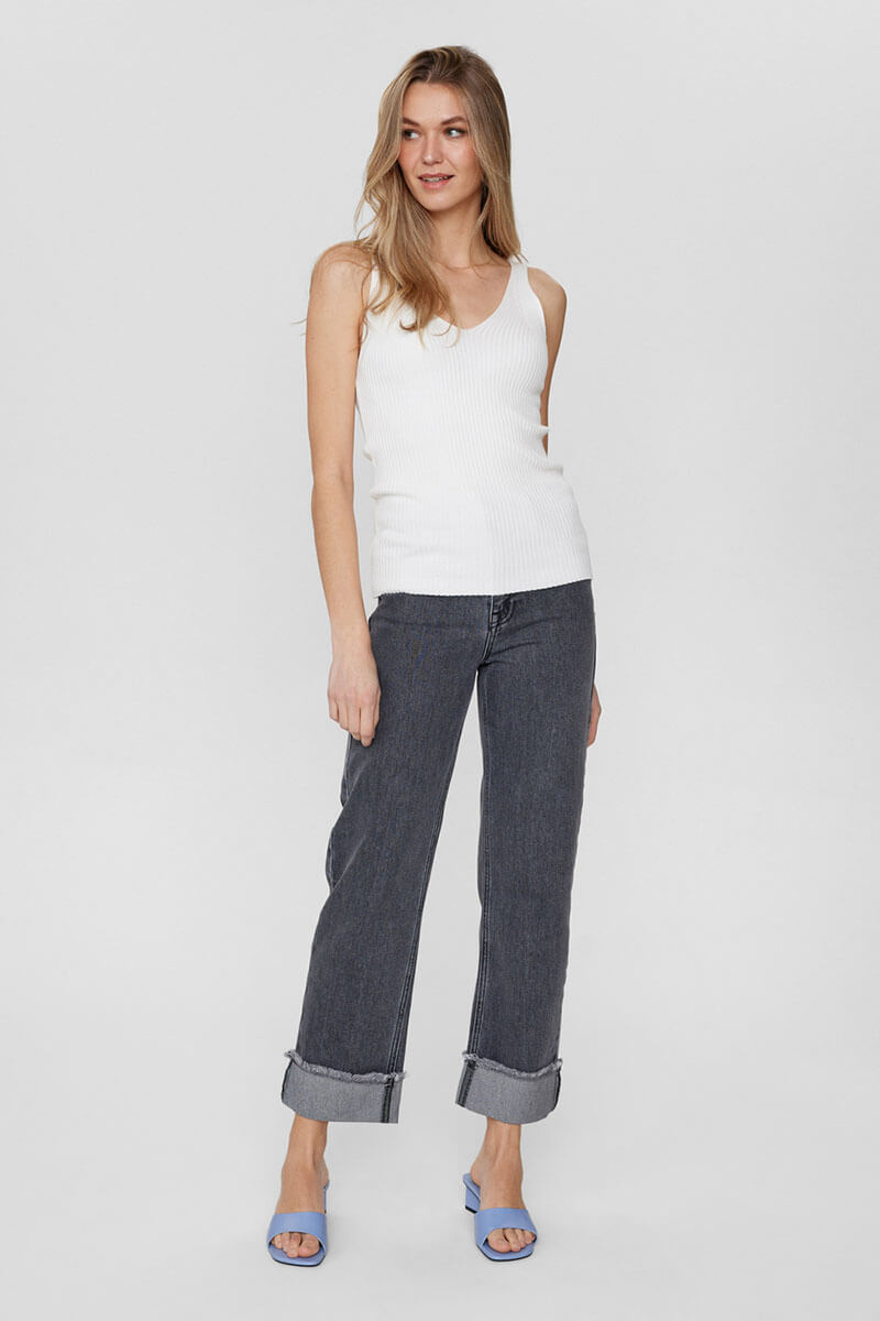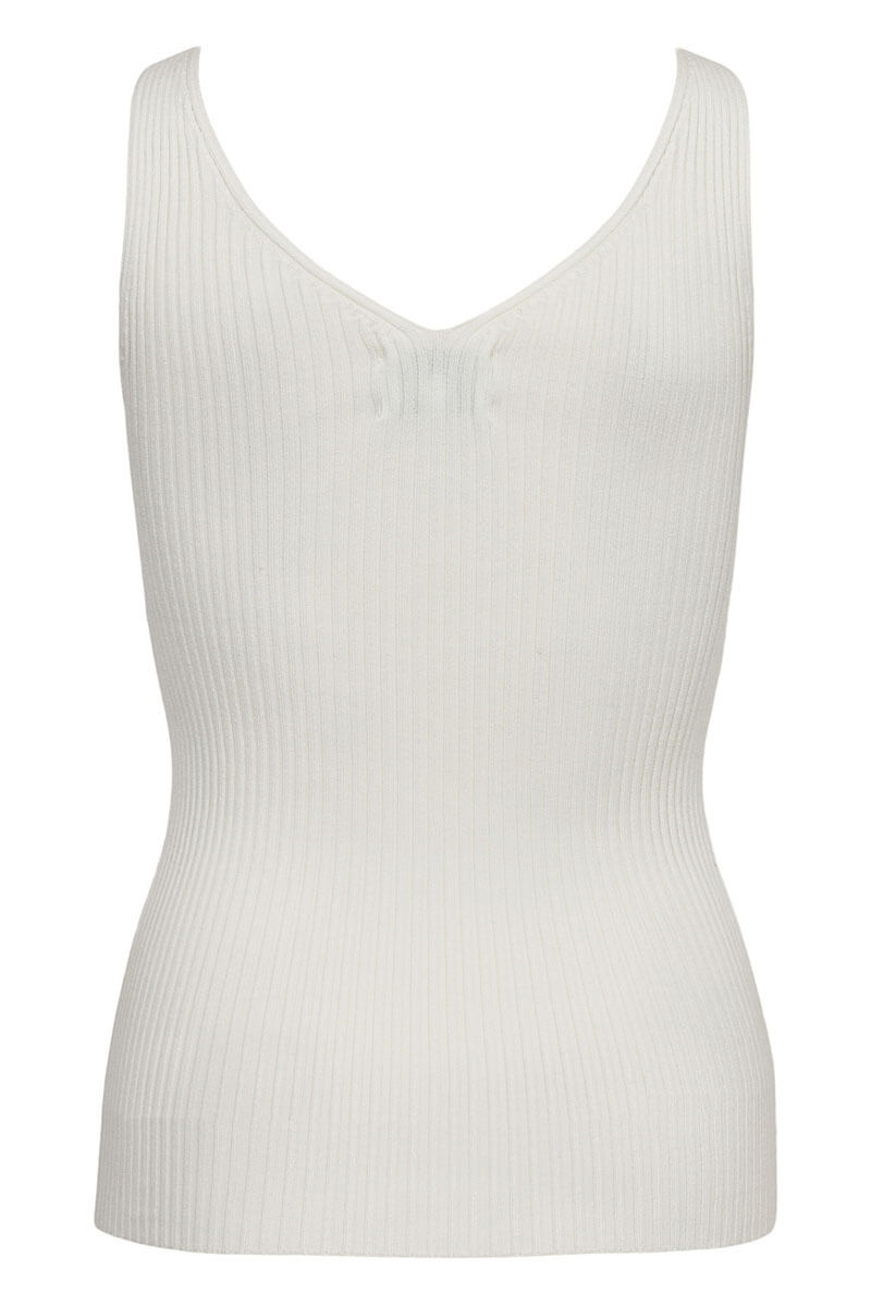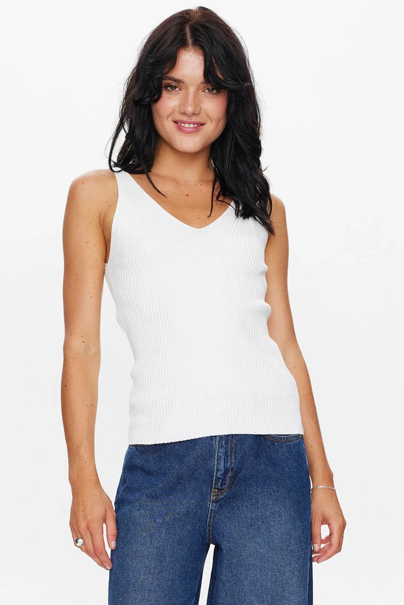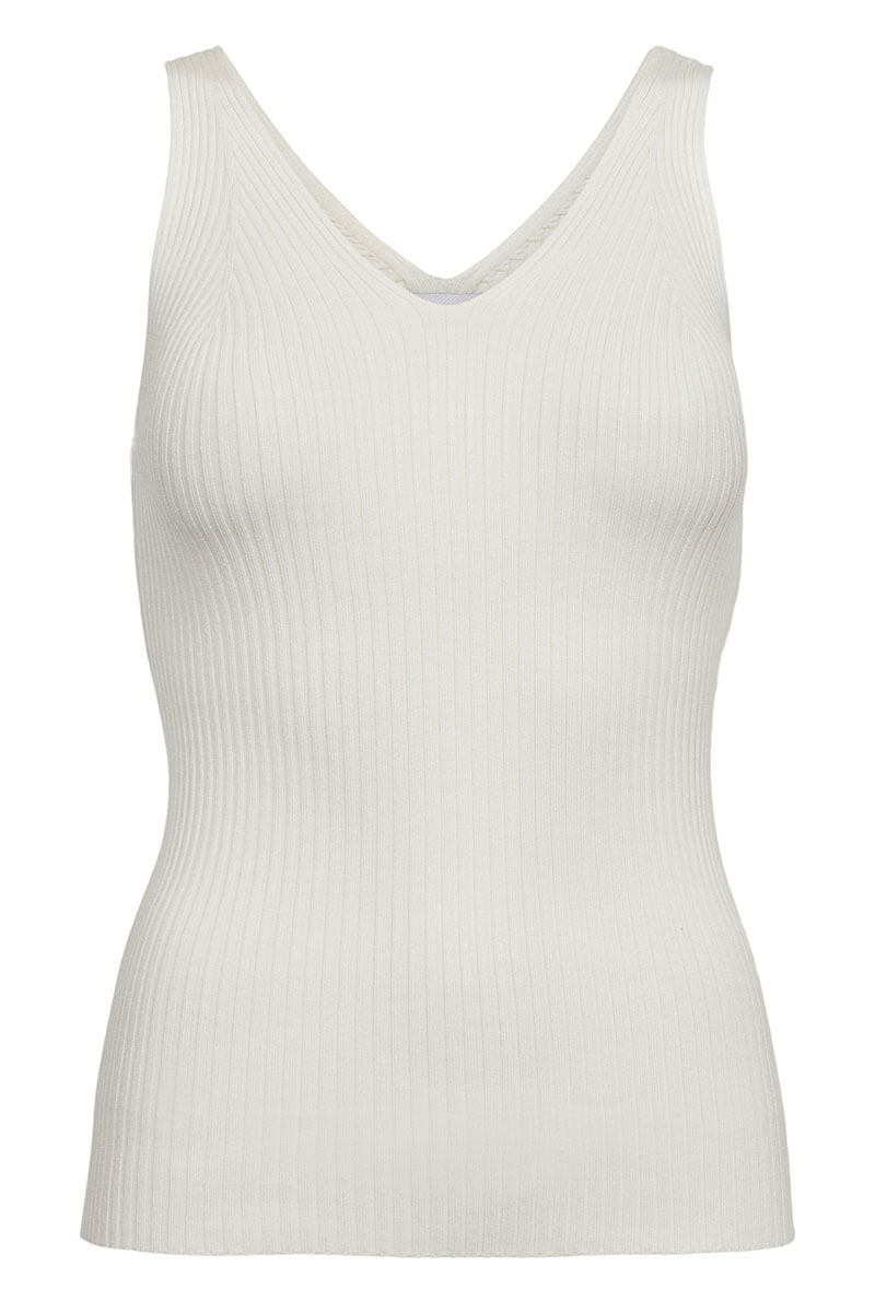 The white, ribbed V-neck tank top is just what your wardrobe is missing. Fresh, classic and just as stylish with tailored clothes as it is with vintage jeans. When simple elegance is all that is needed.Ribbknitted tank top in a viscose blend with slim fit, stretch, wide shoulder straps, v-neckline front and back from Nümph.