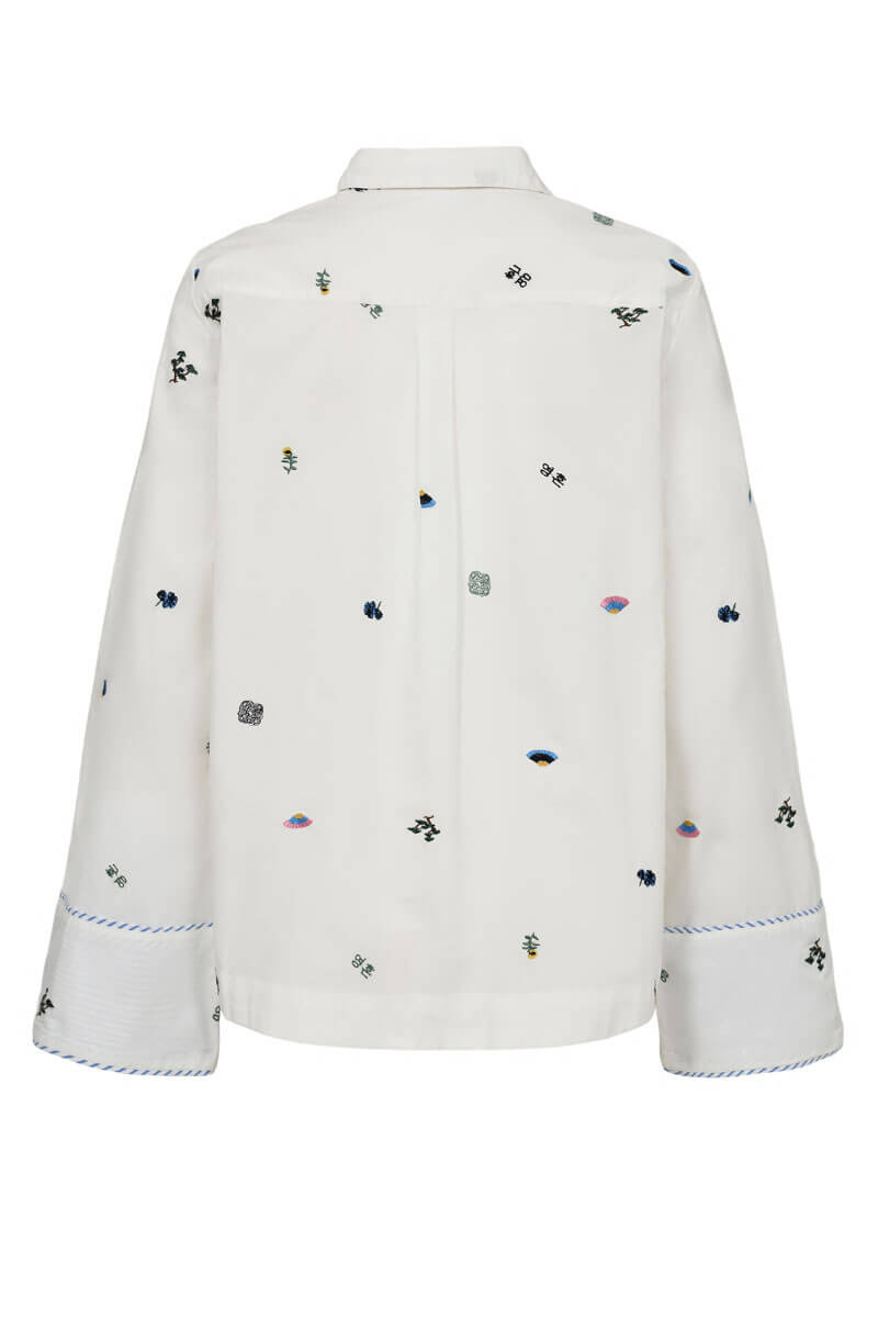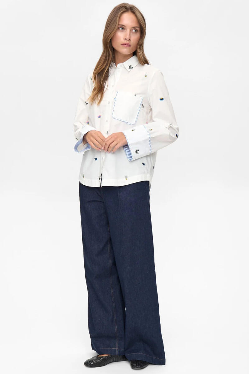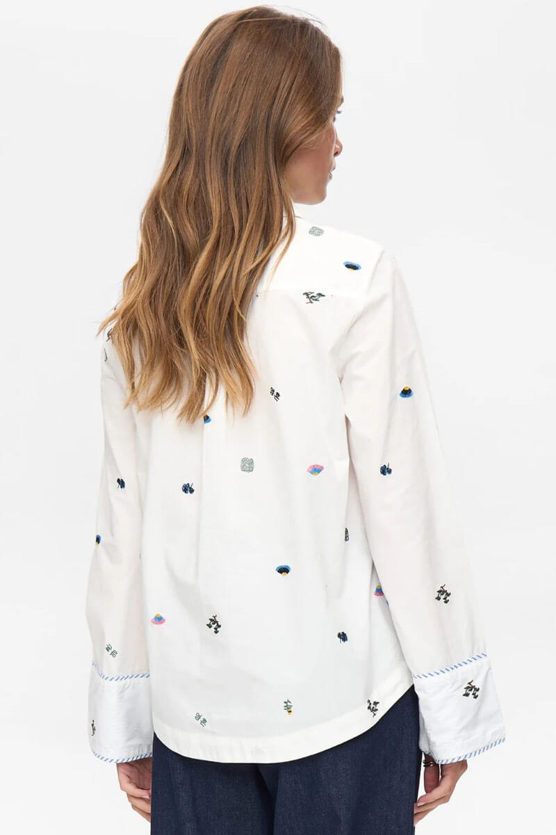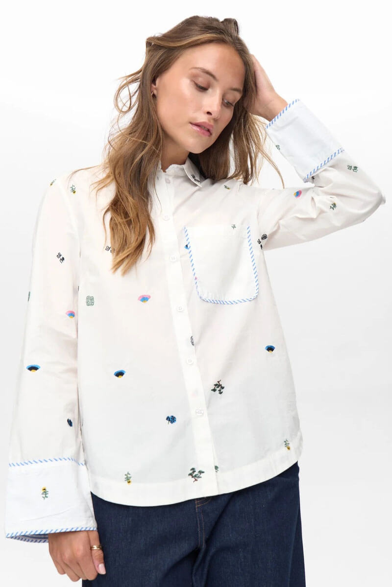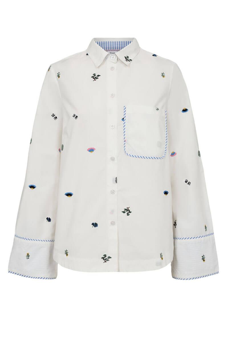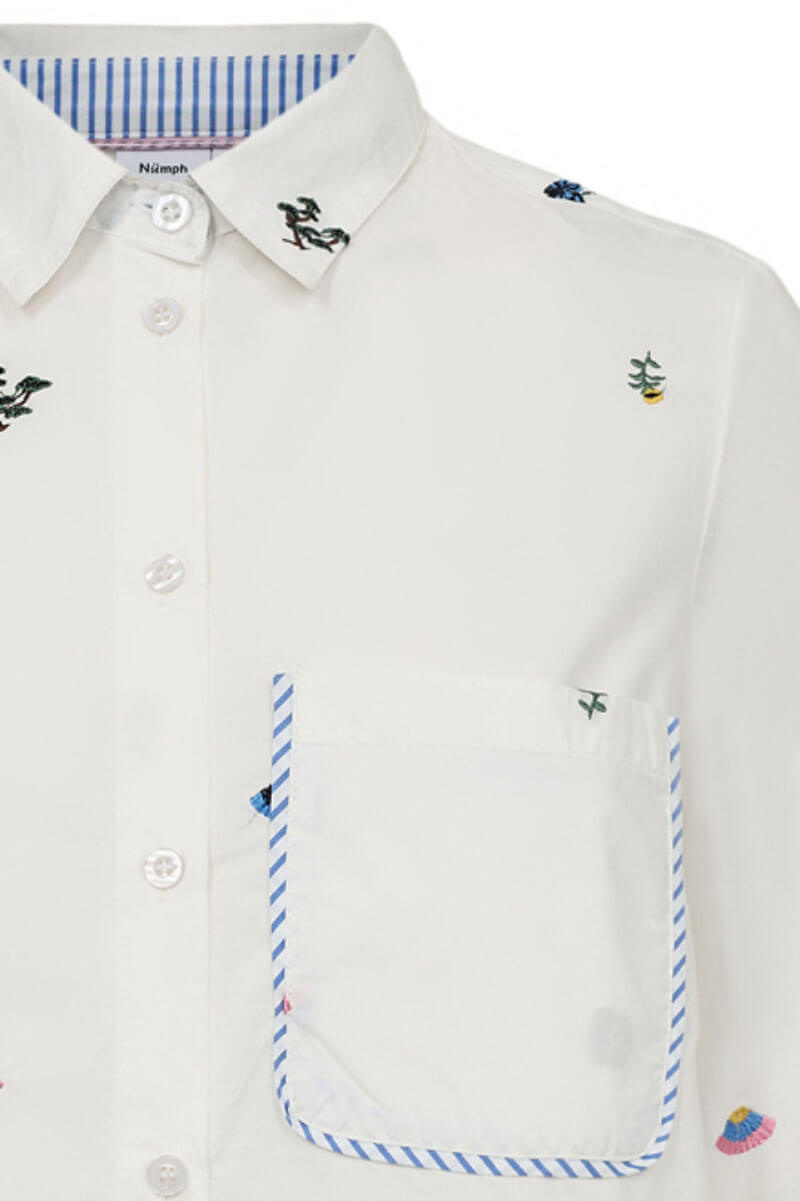 This white shirt with playful embroidery and a relaxed fit is a new wardrobe favorite. Wear it loosely over denim for a cool balance!Shirt in a crispy cotton with embroidered print, boxy fit, chestpocket, closes with buttons front and contrast colored edges from Nümph.