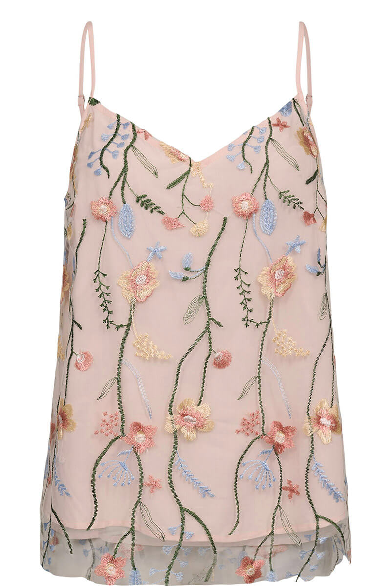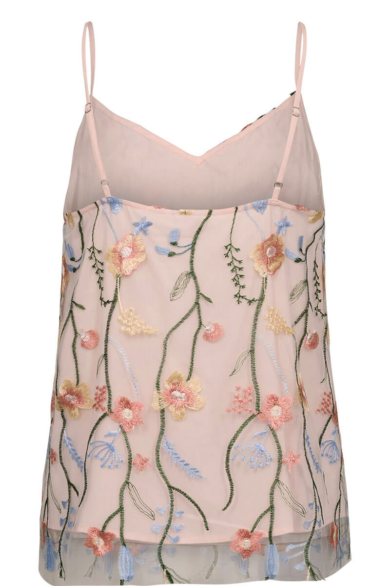 The top is beautifully detailed with embroidered floral vines on airy tulle, creating a feminine and exclusive feel. It is fully lined for added comfort and features adjustable straps for a perfect fit.