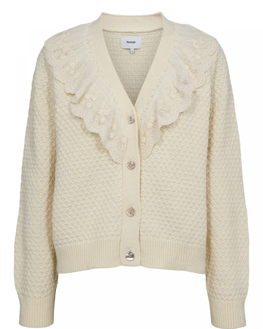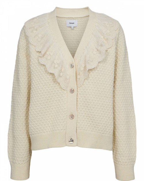 The cardigan is made from a comfortable blend of cotton, wool, and synthetic fibers that provide warmth and comfort from Nümph.