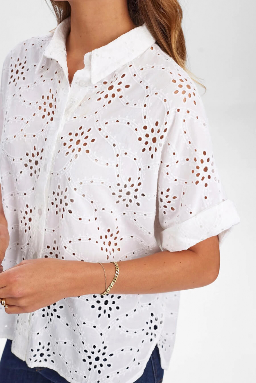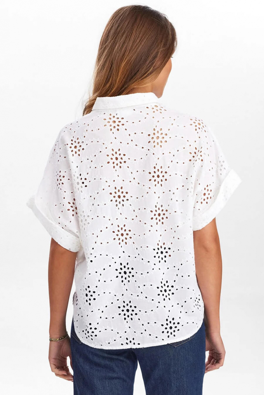An embroidered blouse that exudes timeless elegance and cool summer evenings. The rolled-up sleeves give a casual touch - perfect for both jeans and a linen skirt. A must-have in the wardrobe for those who want to combine classic with modern.Short sleeved blouse in cotton with anglaise print, folded up sleeves, button closure front and collar from Nümph.