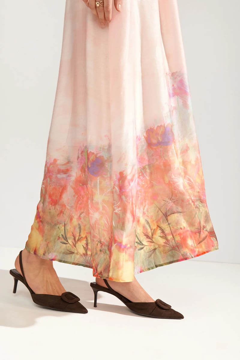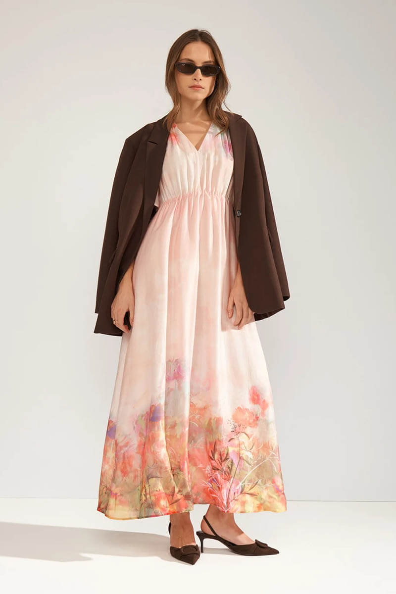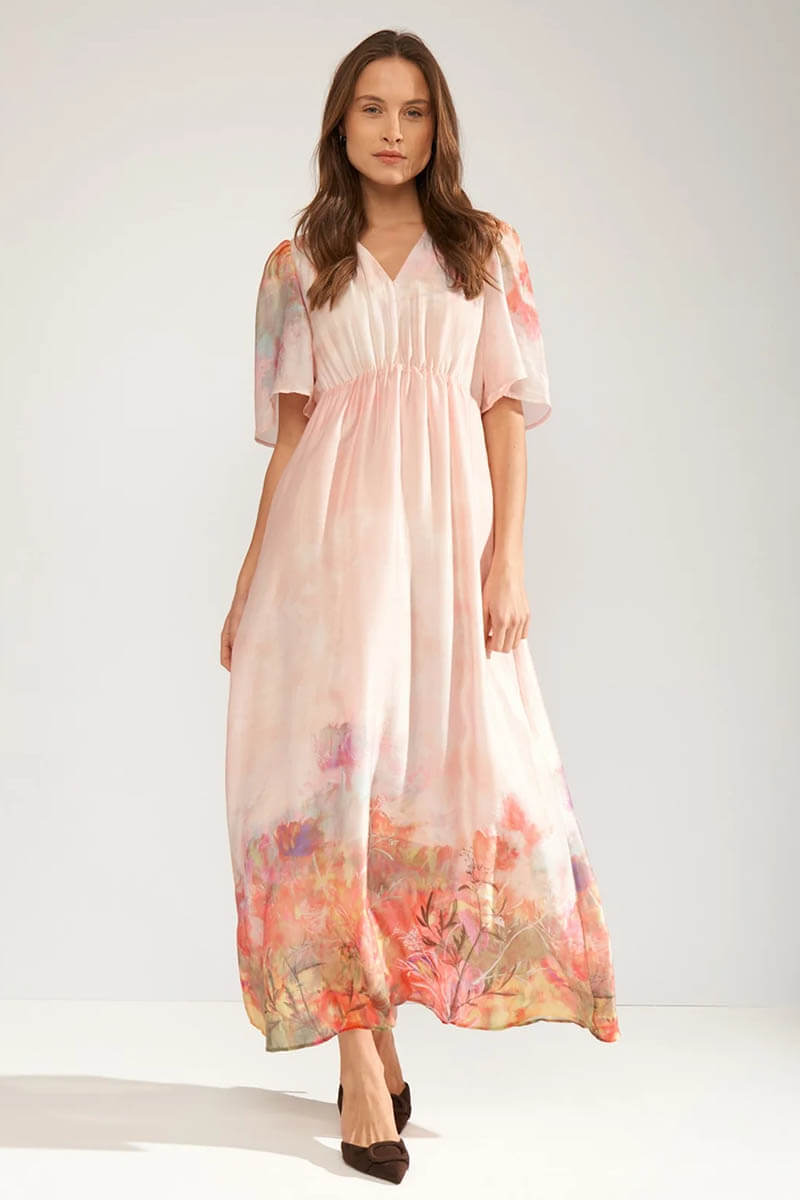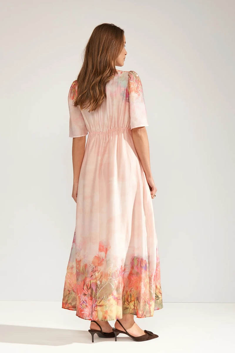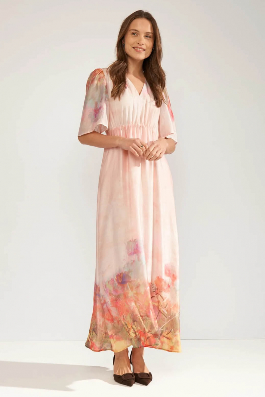 Lovely dress with short arms and v-neck.A dress from Danish Nümph with short sleeves and a V-neck, lined in a beautifully patterned viscose fabric. Elastic at the waist and true to size. Pair it with elegant sandals or pumps for a wedding.