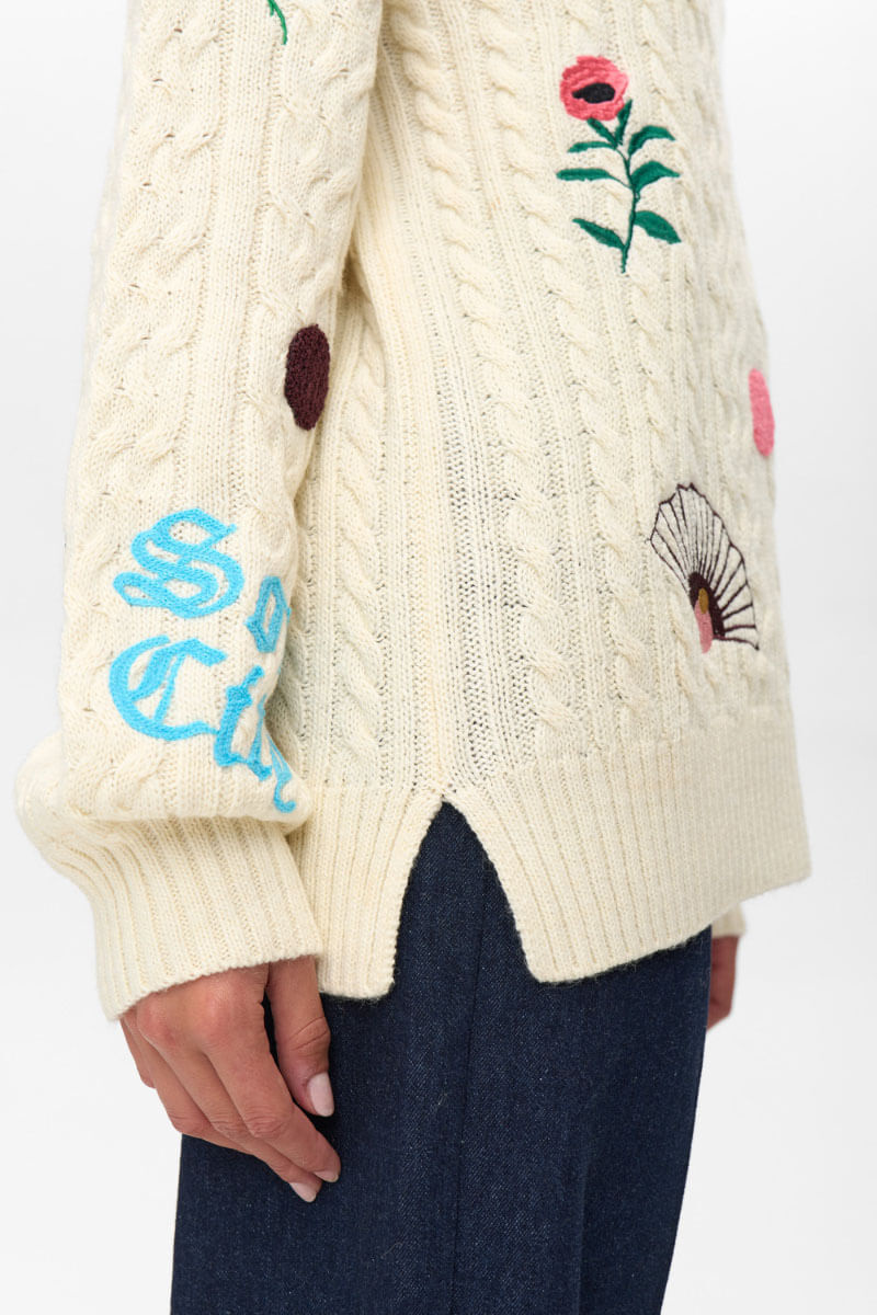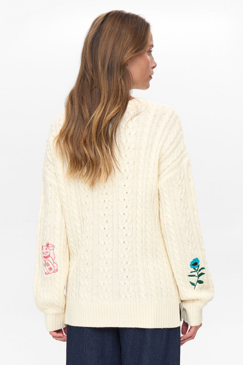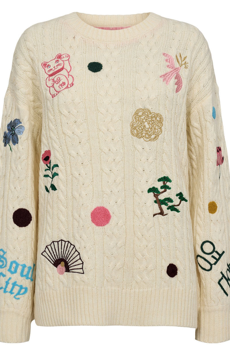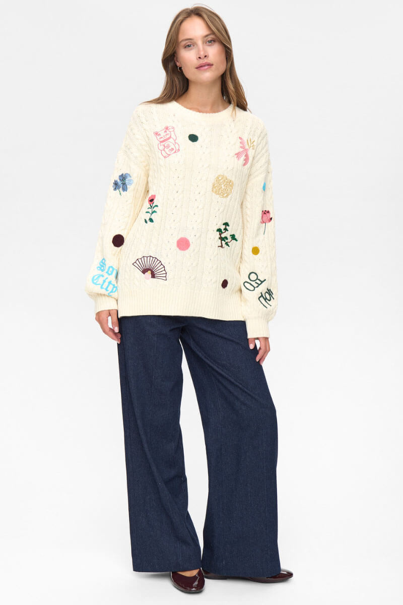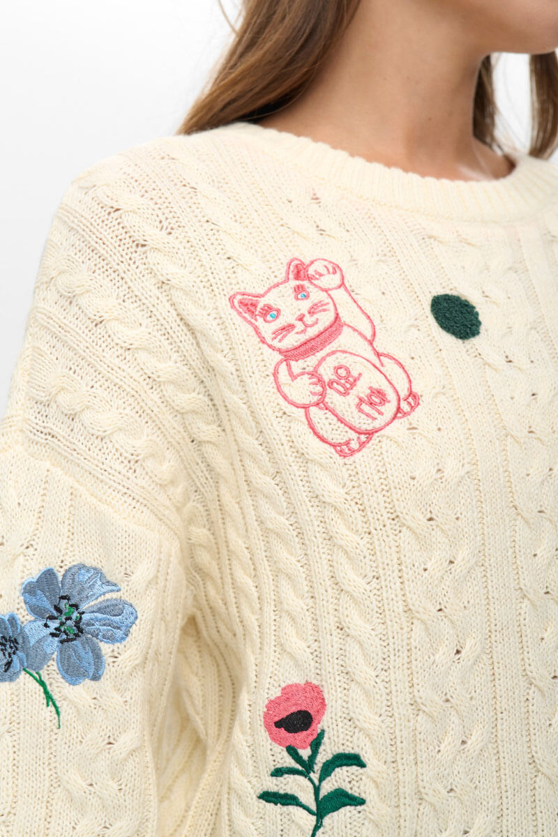 Beige knitted sweater with playful embroidered details that add a unique and personal touch. Perfect styled with jeans for a relaxed everyday look or with a skirt for a more feminine feel.