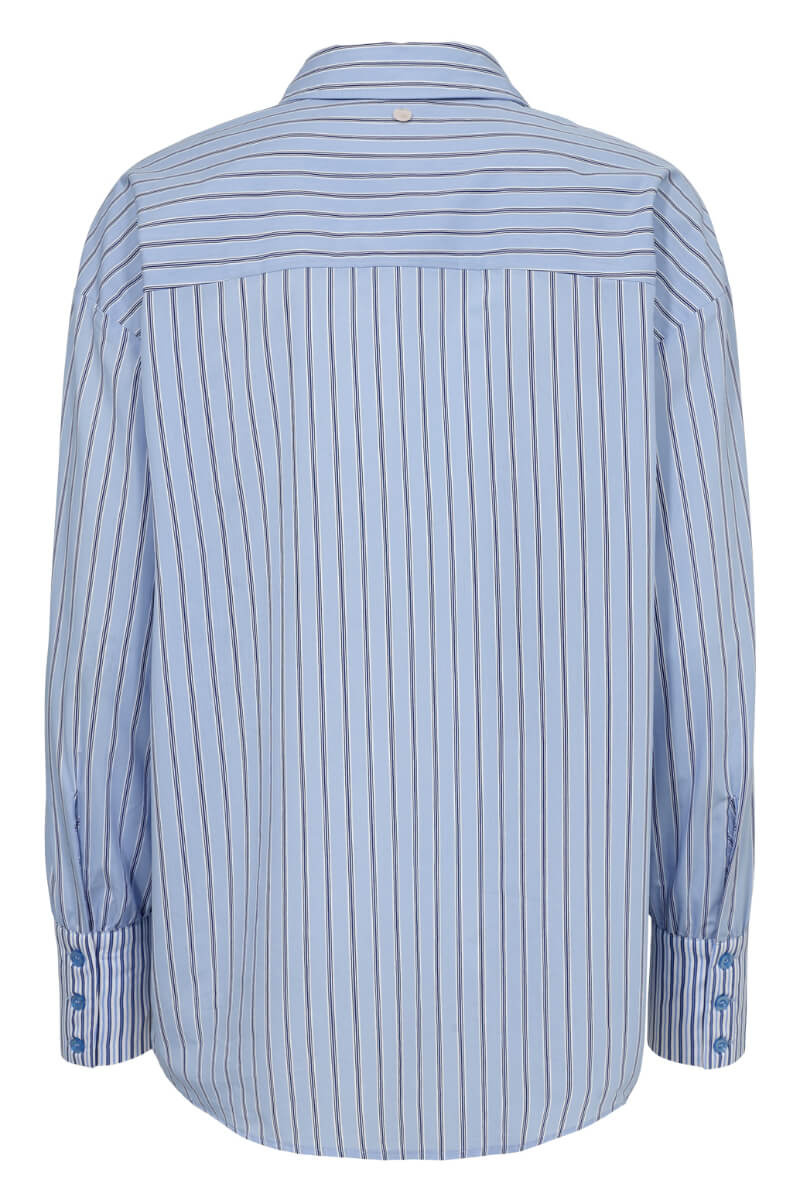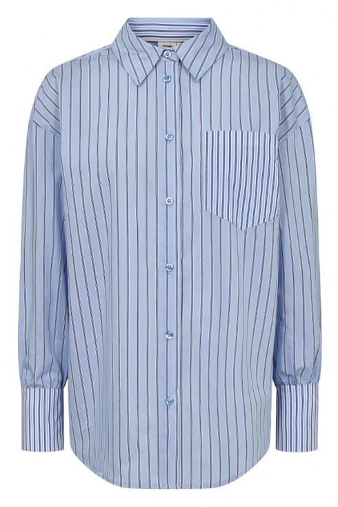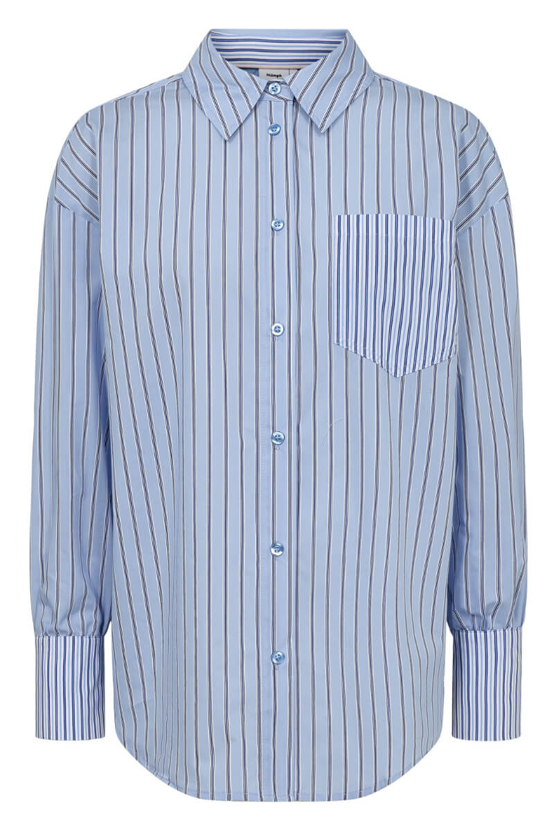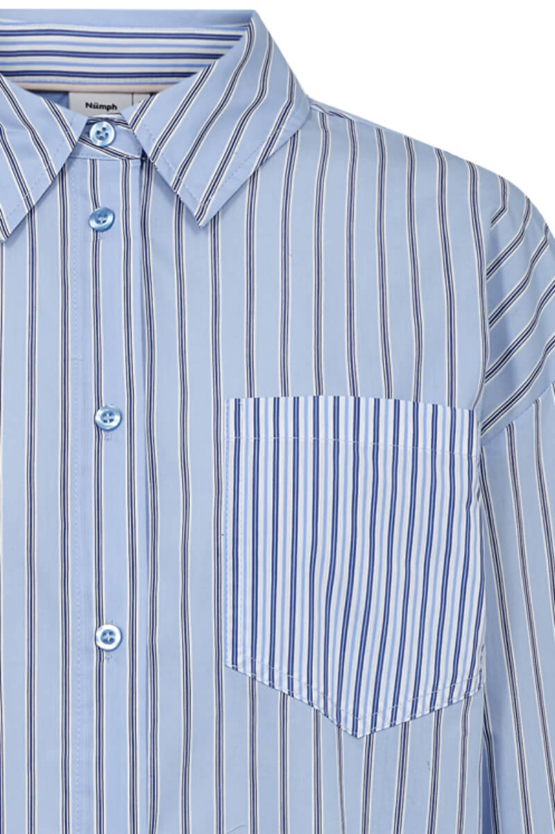 Striped shirt in blue tones that exudes minimalist elegance with a twist. Style oversized over a short skirt or buttoned up with suit trousers for a sharp contrast. A statement piece that works just as well in the city as in the office.Striped shirt in a soft cottonblend with loose fit, chestpockeet, collar, button closure front and falling shoulder seams from Nümph.