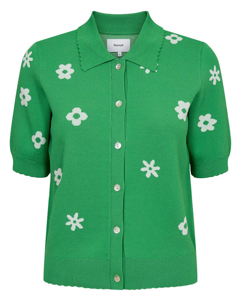 A knitted cardigan in a vibrant green shade with white floral details for a clean yet expressive look. Designed with a collar and a soft, comfortable knit that works just as well worn buttoned as open. Easy to style with jeans, skirts or layered over a dress.Knitted cardigan with collar and floral pattern from Nümph.