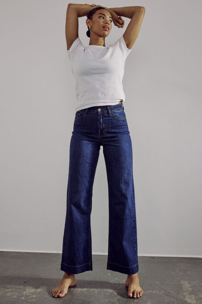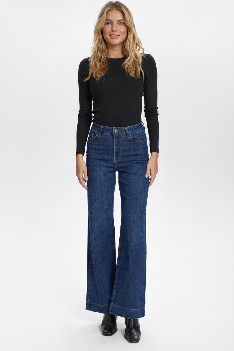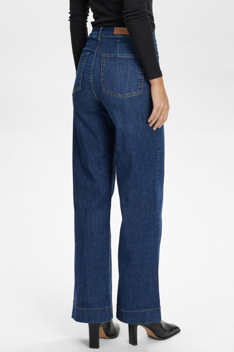 Classic, full-length dark blue jeans provide a stylish foundation for countless outfits. Pair with a tailored shirt and loafers for a polished look, or with a soft t-shirt and sneakers for a casual yet sophisticated everyday style.Stretchy jeans in a cotton blend with wide legs, high waist and full length from Nümph.