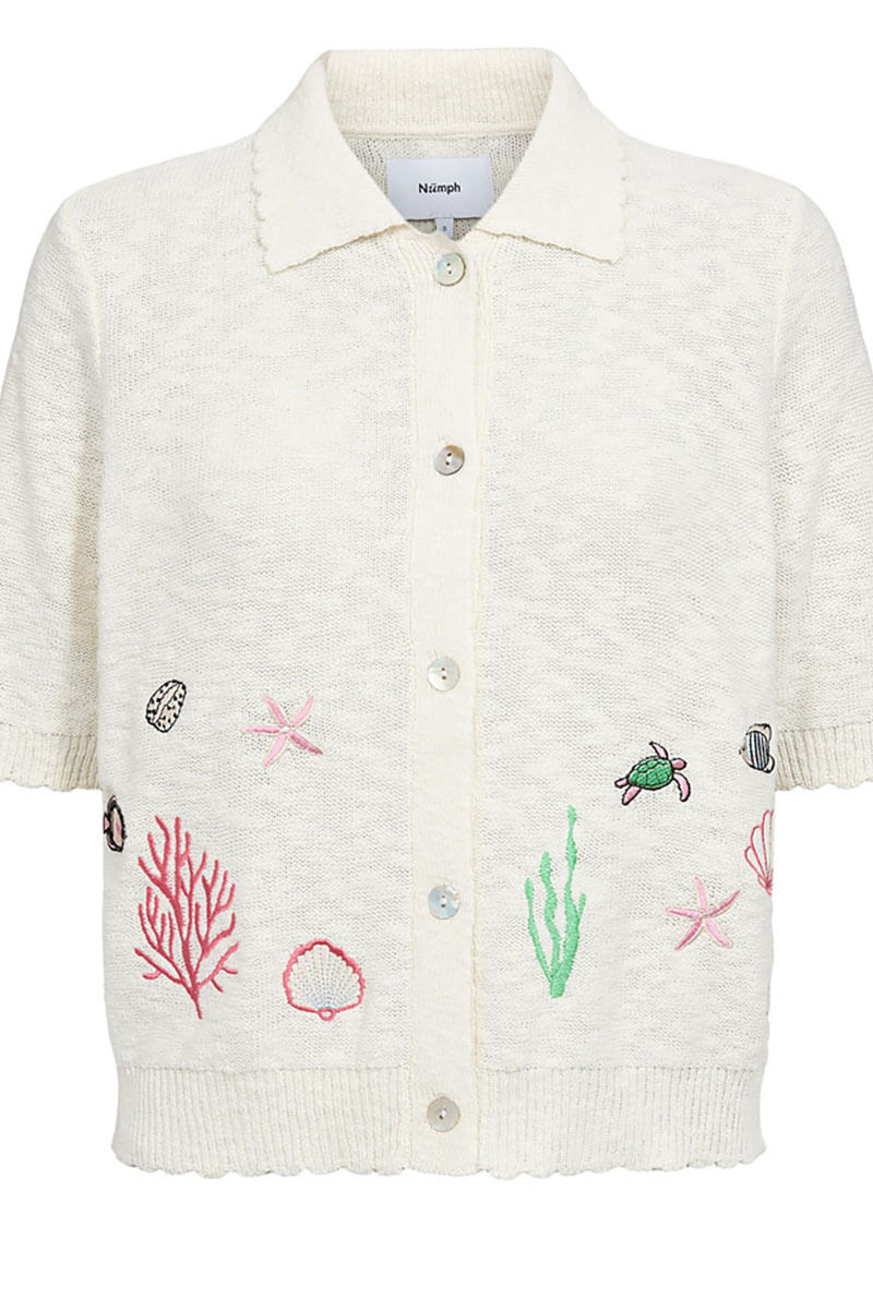 This beautiful cardigan adds that little extra to your jeans or a skirt this summer. Knitted in a soft cotton quality with embroidered appliqués from Danish Nümph. Light and summery—perfect to wear on its own or layered over a dress. The color has a soft cream-white tone.