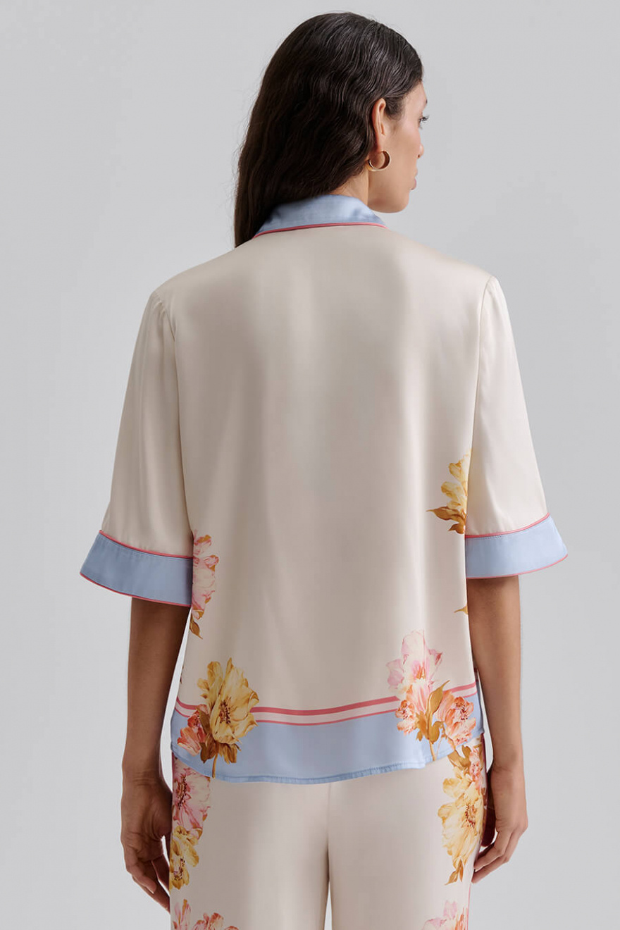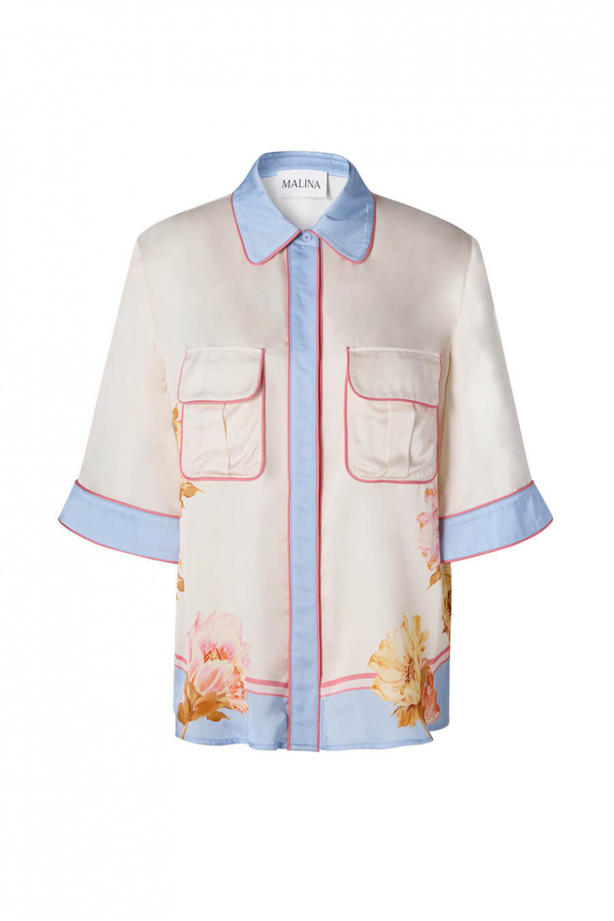 A short-sleeved satin shirt with a floral pattern that exudes modern elegance. The loose fit gives a casual but sophisticated look. Equally natural with tailored trousers as with denim.Patterned shirt in satin with chest pockets, short sleeves, contrast colored edges, closes with hidden buttons front and loose fit from Malina.