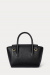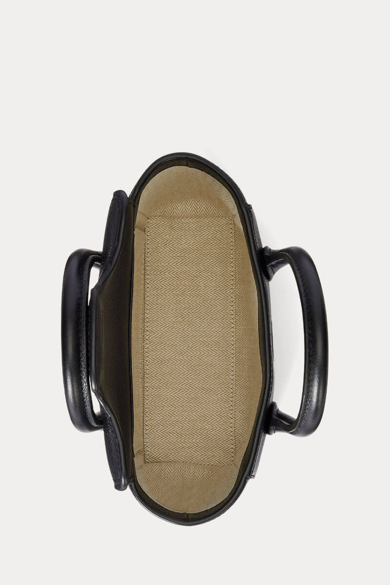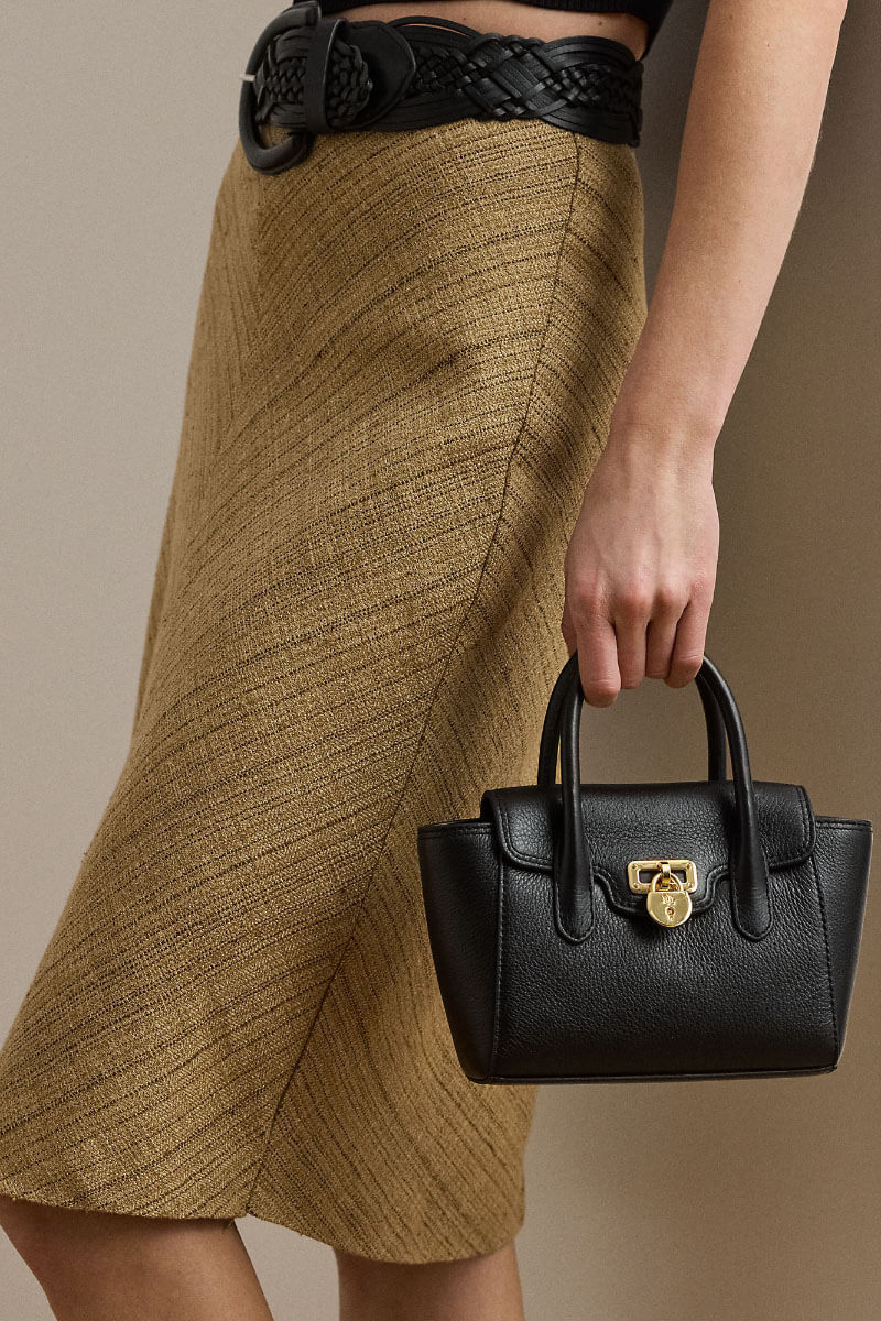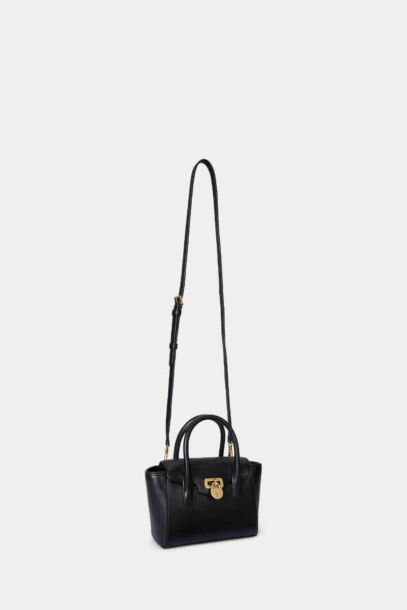 Den svarta handväskan i skinn är definitionen av diskret elegans. Med rena linjer och gyllene metalldetaljer lyfter den varje look – oavsett om du bär den till citykappan eller kostymen. En modern klassiker i ständig rotation.Small leather handbag with double handles, removable adjustable shoulder strap, an inner pocket and closes with a flap with magnet at the front from Lauren Ralph Lauren.