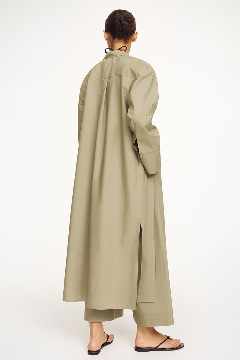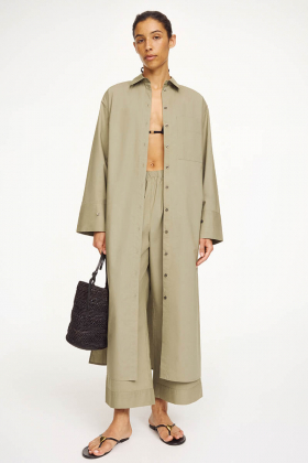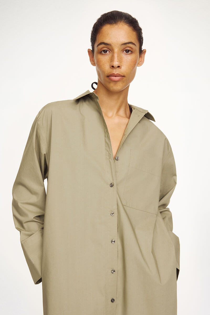 Made in nice crisp and breathable organic cotton, the button-down maxi dress is detailed with a single front pocket, adjustable cuffs, side pockets – and high side slits.