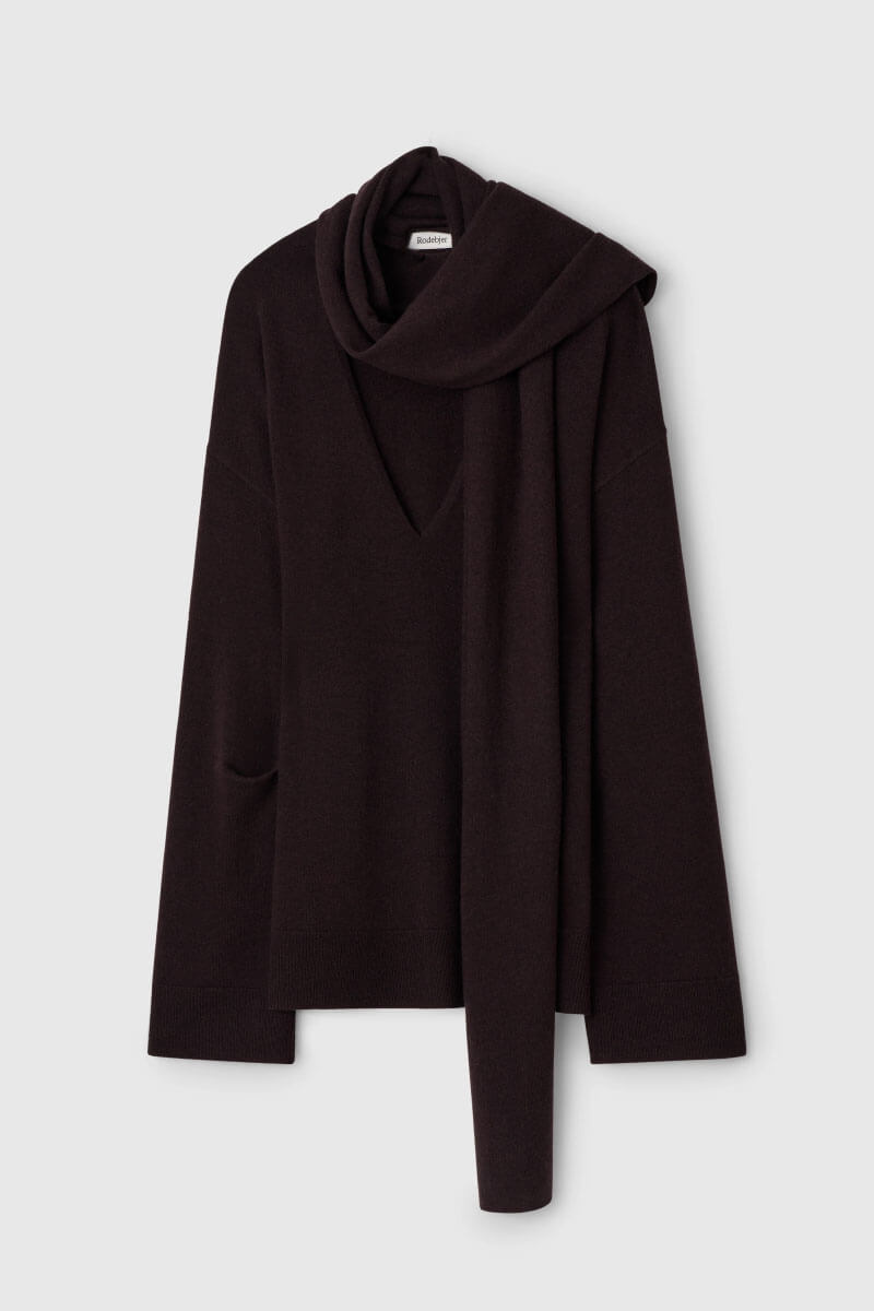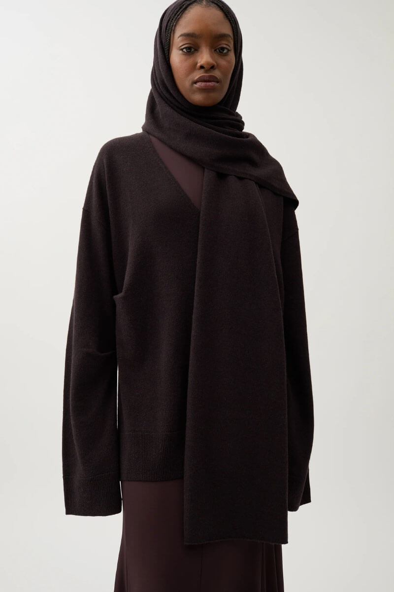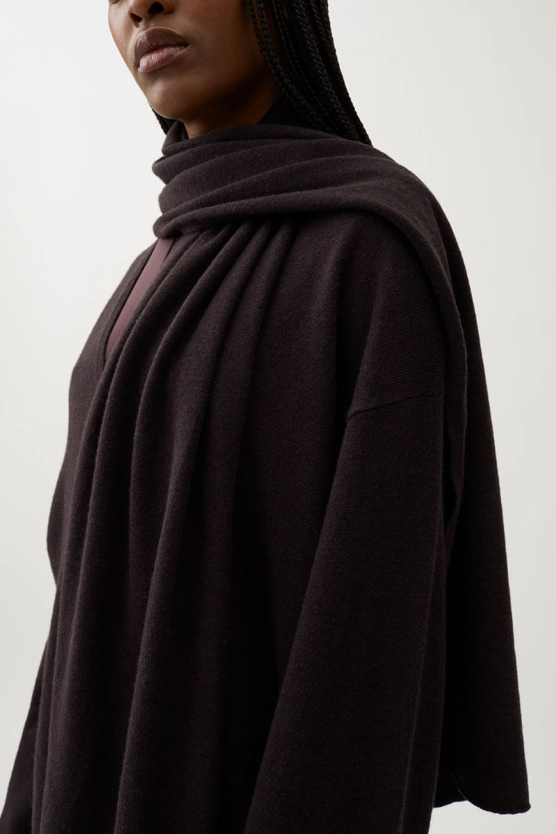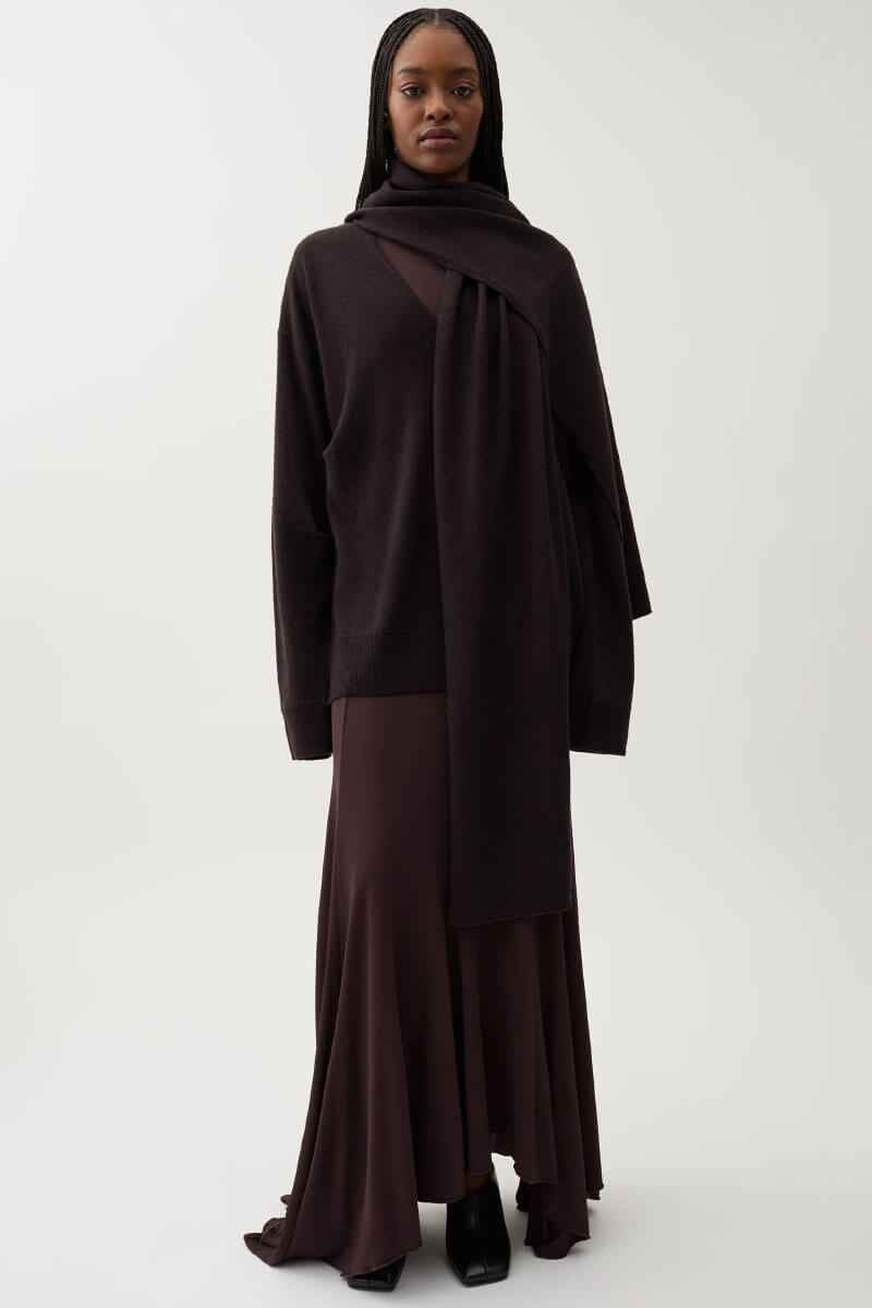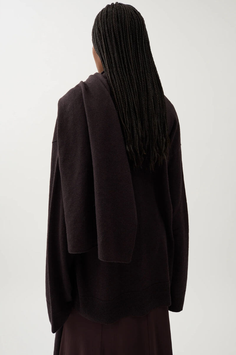 Dark brown sweater in soft merino wool with a loose fit. Stylish with dropped shoulder seams and matching shawl for versatile styling. Combine with slim pants and ankle boots for an elegant, casual and timeless look.Knitted sweater in soft merino wool with a loose fit, v-neck, ribbed edges, dropped shoulder seams and matching shawl from Rodebjer.