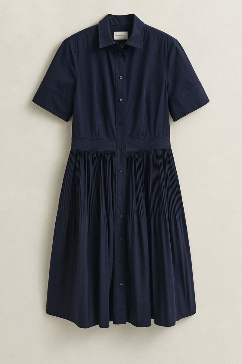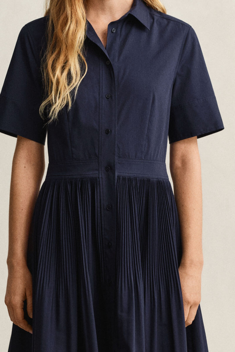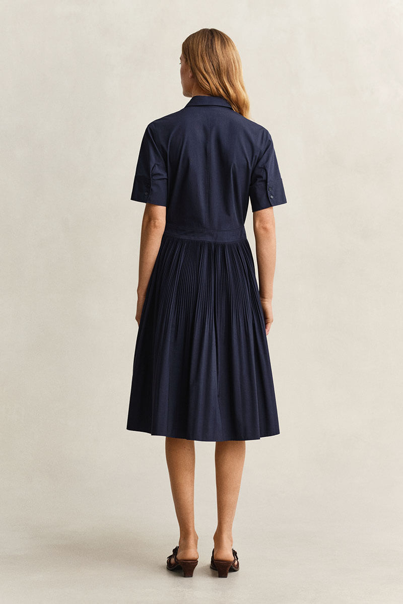 Crafted from premium cotton, this shirt dress blends classic shirting details with a modern, refined silhouette. Designed with a regular fit and a hem that falls below the knee, it features a point collar, short sleeves, and a center-front placket with buttons made from recycled polyester. The design is completed with a pleated A-line skirt, subtle gathers at the waistband, and darts at the front and back for a structured, flattering shape.