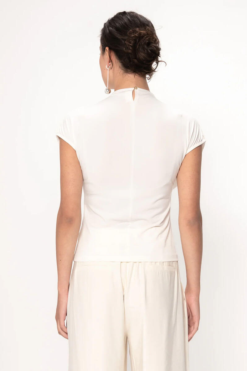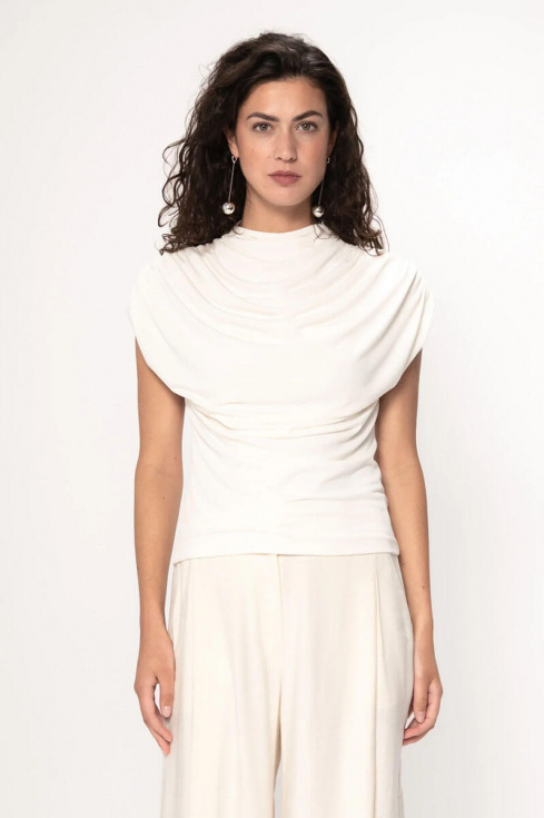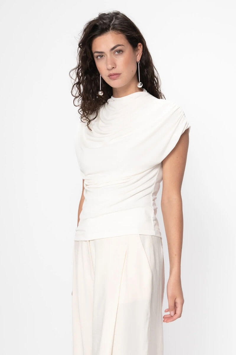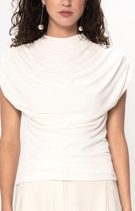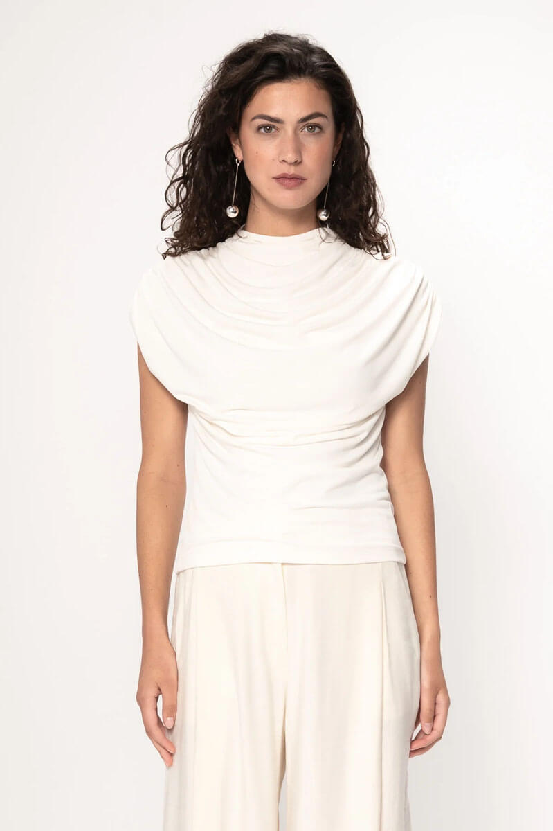Viveh signature Mirel top is cut in smooth jersey with a softly draped front that shapes the neckline and upper body, while the lower section sits cleanly against the body. Thoughtfully designed for both effortless everyday elegance and occasional wear.Material: