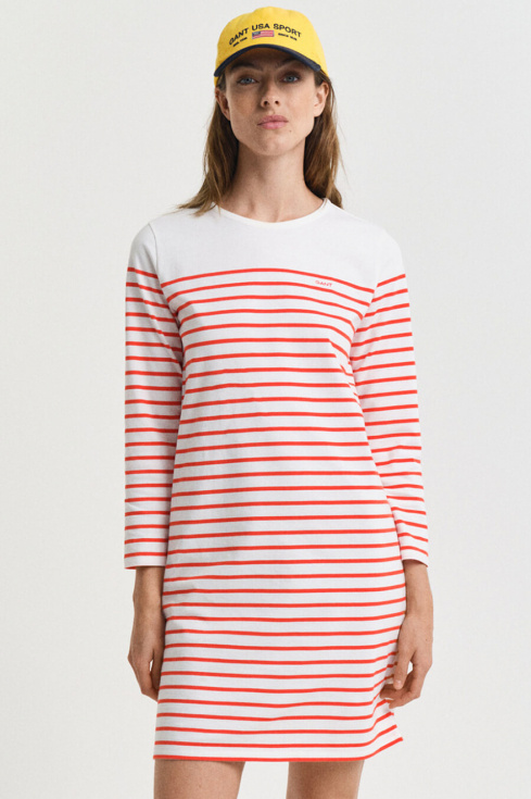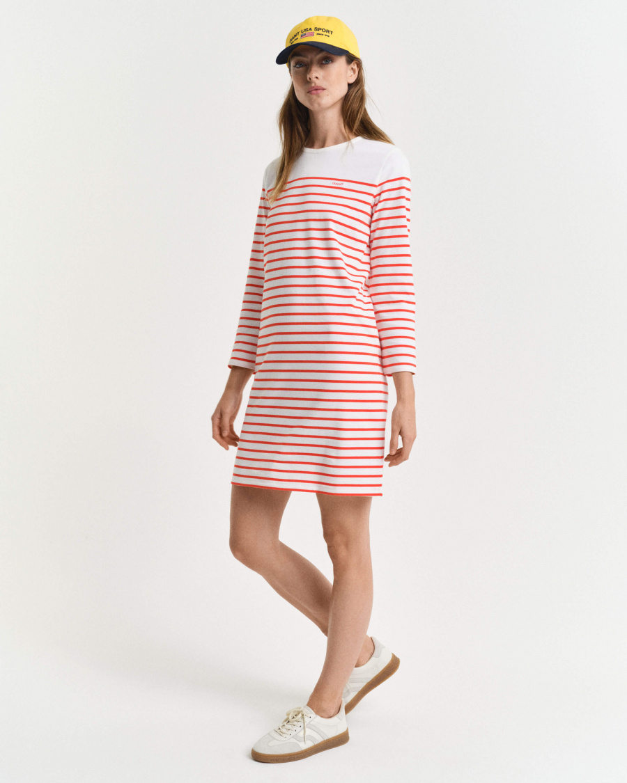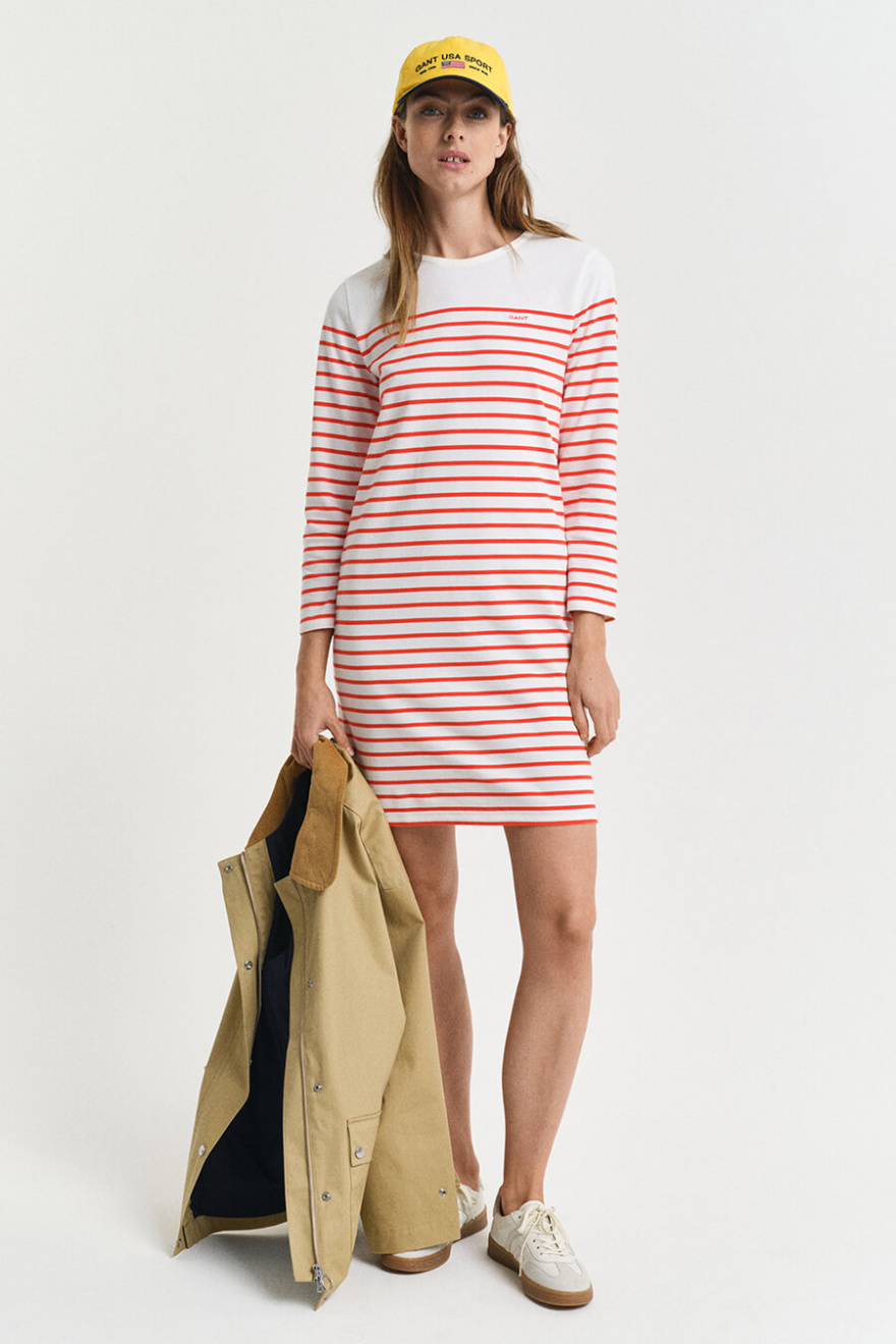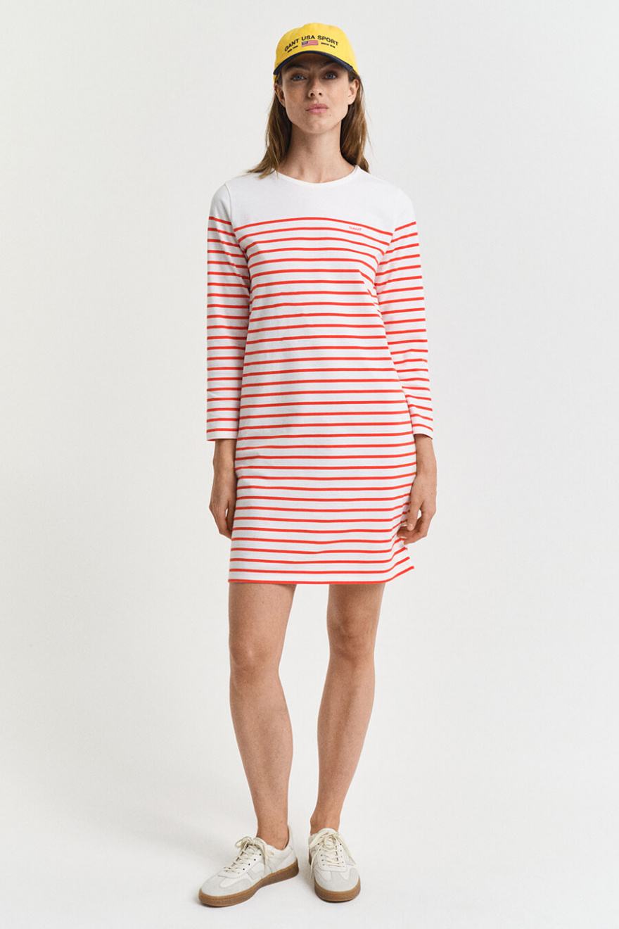 This striped dress in a maritime style is a timeless wardrobe classic. With a relaxed fit and 3/4 sleeves, it is perfect for both city walks and beach hangs. An investment in comfort and style that will last season after season.Striped dress in cotton with round neckline, 3/4 sleeves, regular fit and small embroidered logo front from Gant.